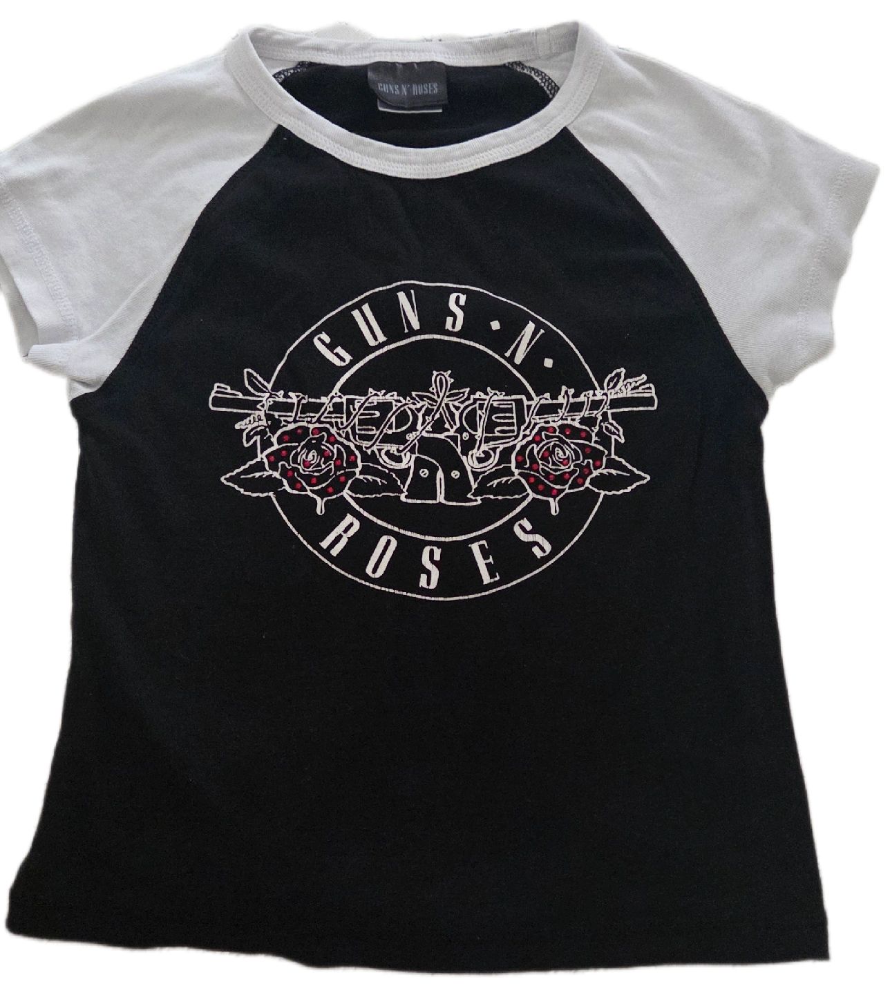 10A Guns N' Roses T-shirt with a black body and white sleeves! It features the classic Guns N' Roses logo on the front. Great for any fan! (100% cotton)