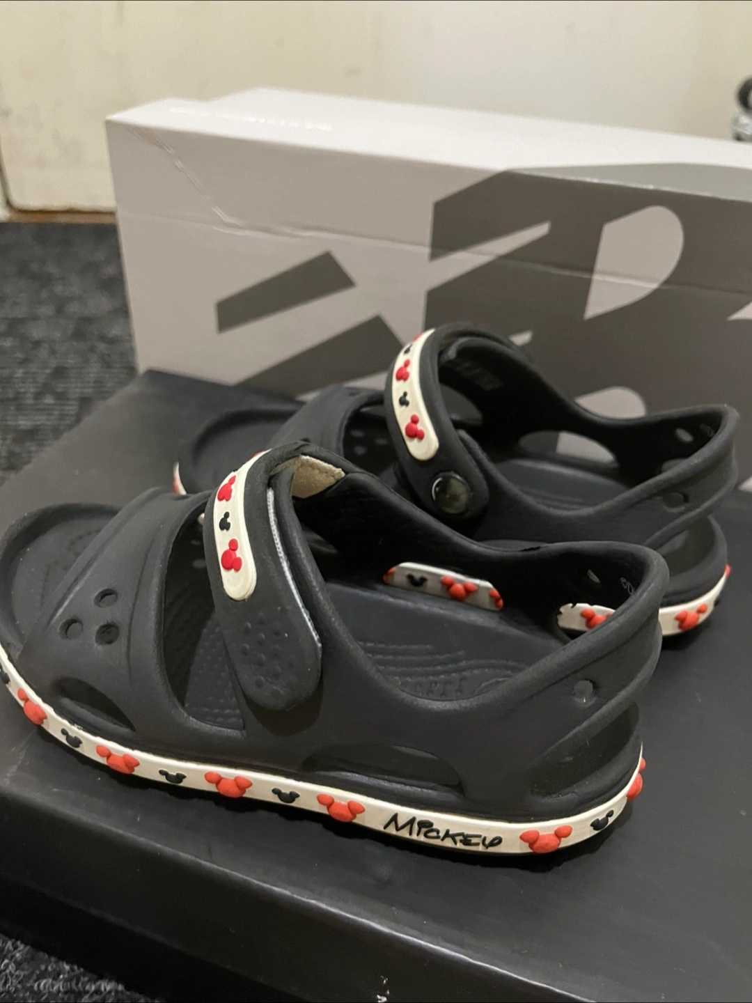 Black sandals featuring Mickey Mouse details, perfect for everyday wear. Great for a day at the park, or a relaxing afternoon stroll for your little ones.