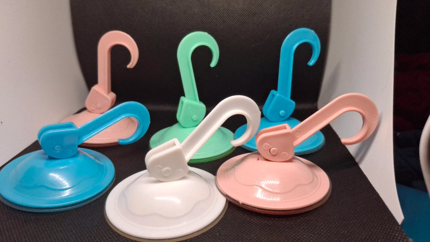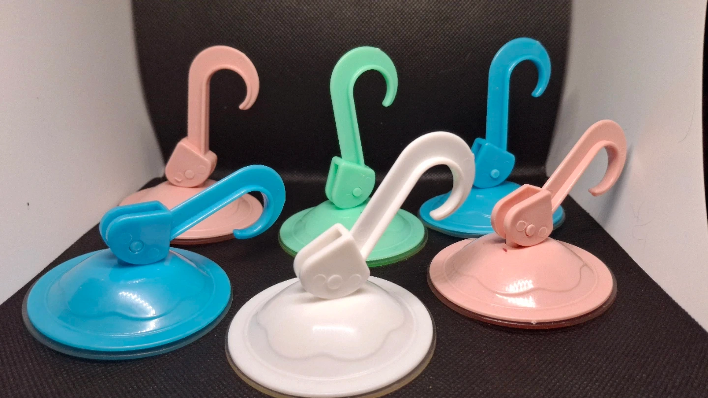 This is a set of six suction cup hooks in various colours. They're great for hanging lightweight items on smooth surfaces like tiles or glass. Includes pink, blue, green, and white hooks.