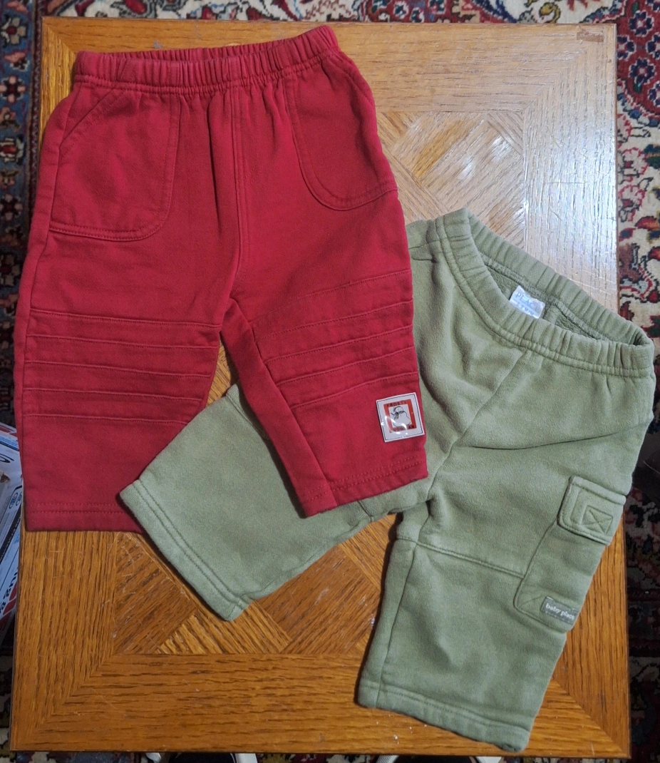 Two pairs of baby pants from Baby Place! One is red and the other is olive green. Both are in great condition and ready for your little one to wear
