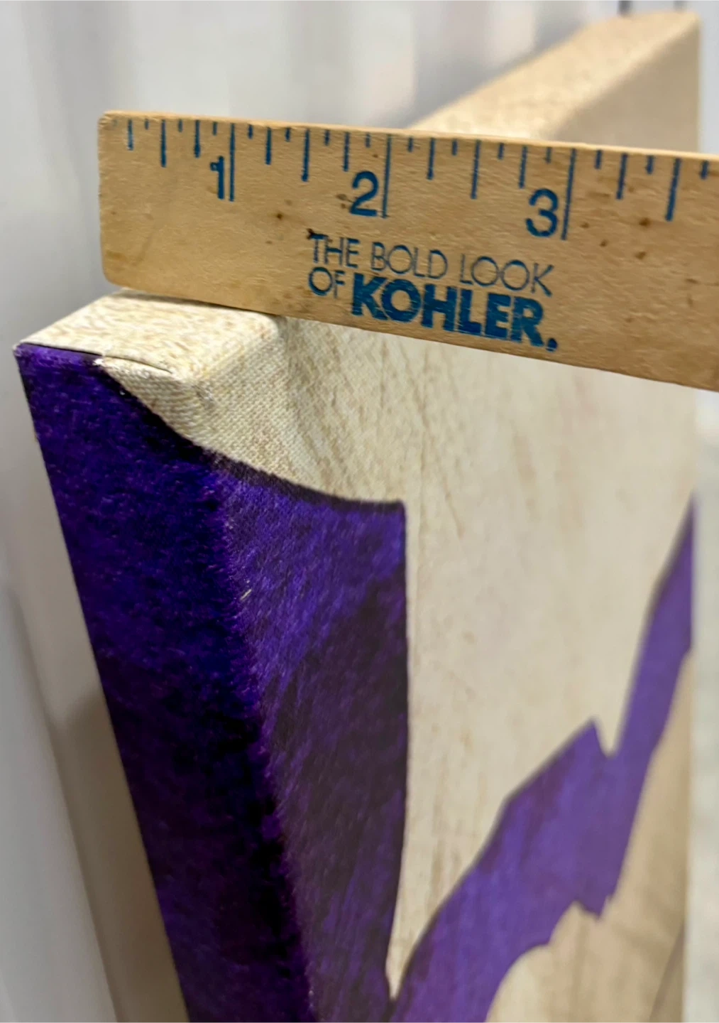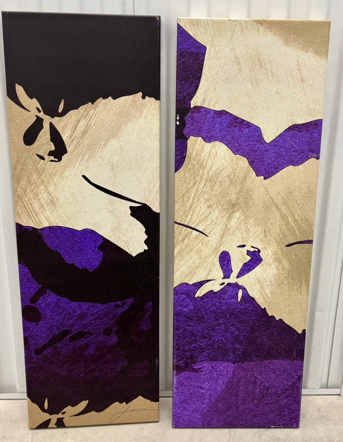 This set includes two abstract canvas wall art pieces. Features a bold design with purple, gold, and black tones. Canvas material stretched over wooden frames. Each piece measures approximately 12 inches wide and 36 inches tall.