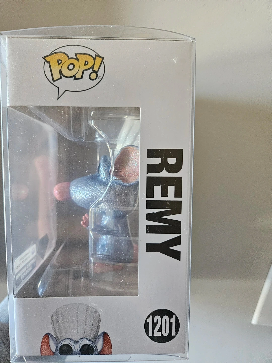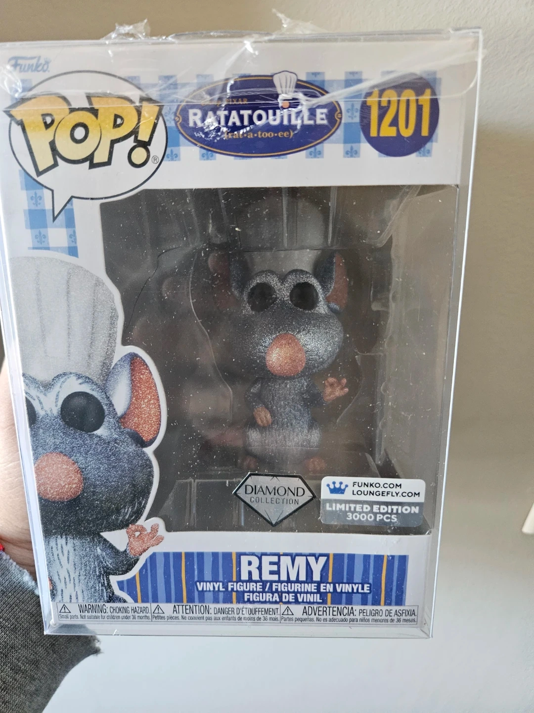 This is a Funko Pop! Vinyl figure of Remy from Disney Pixar's Ratatouille. It's part of the Diamond Collection and a limited edition of 3000 pieces. The figure is in its original packaging. Also comes with the backpack.