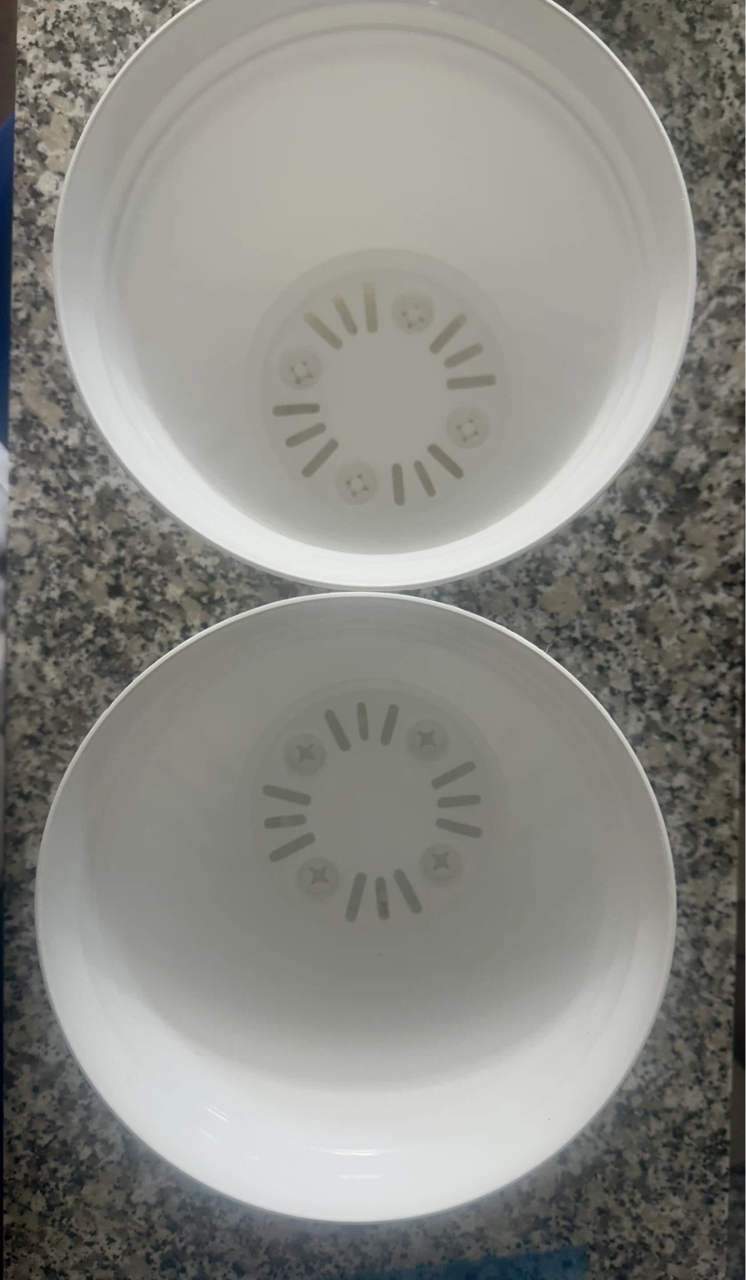 Selling two white plant pots. These pots are made of plastic and are suitable for indoor or outdoor use. They'd be great for housing your favourite houseplants!