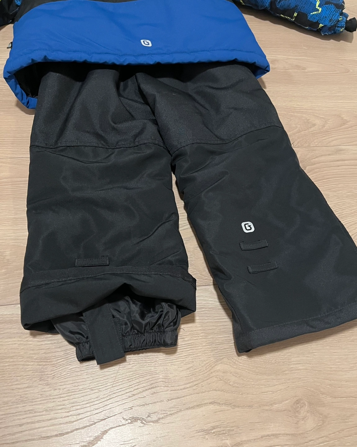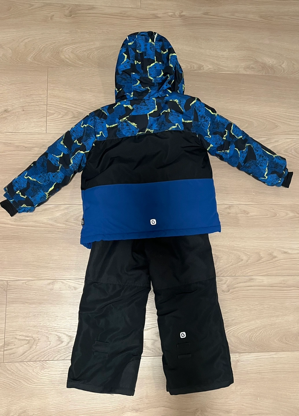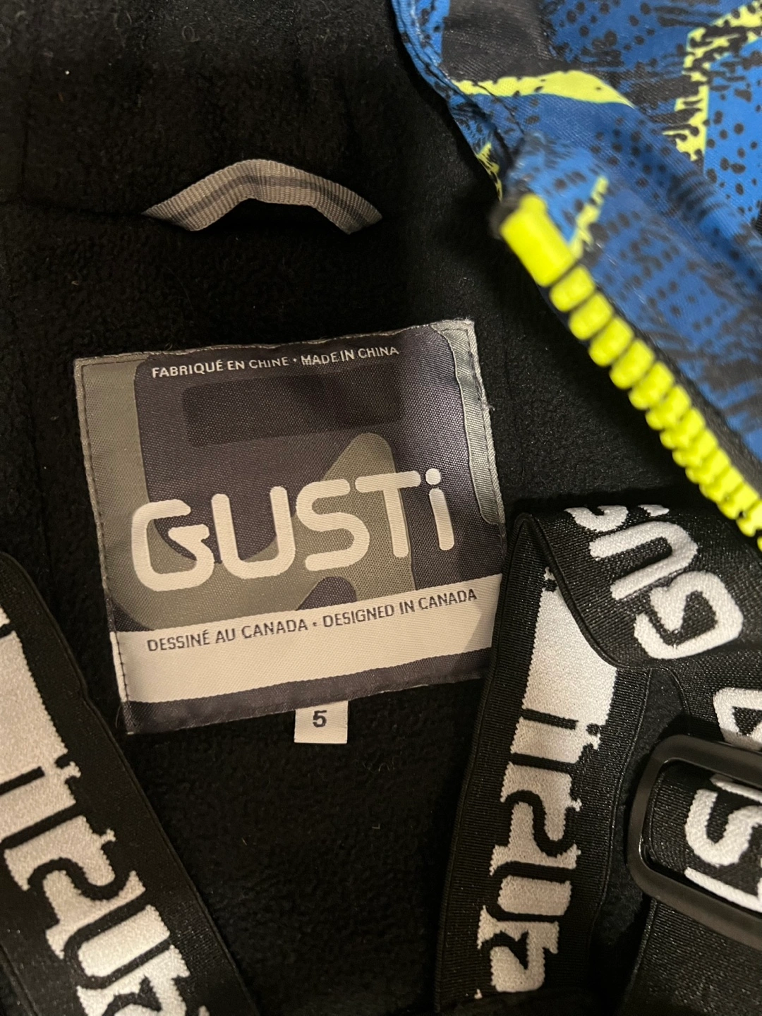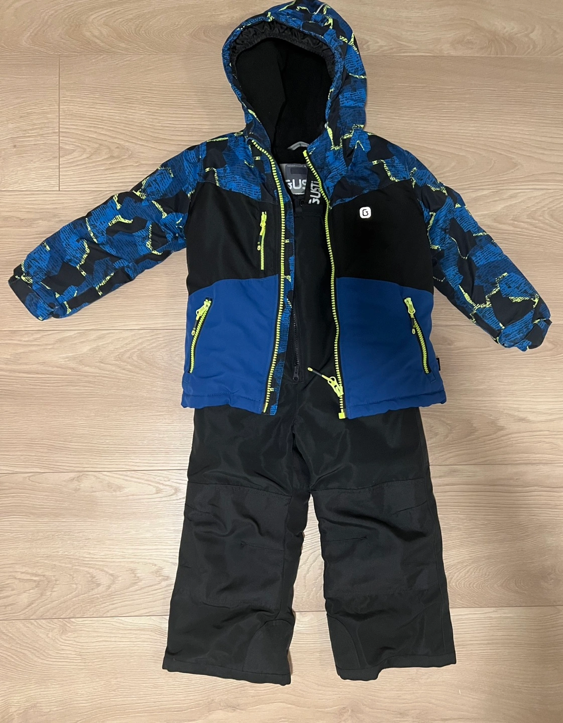 94Gusti kids ski suit in blue and black with a camo pattern. Size 5. Jacket has a hood. Pants have suspenders. In excellent condition, no stain and no rips Retail for 250 plus tax Final pick up only