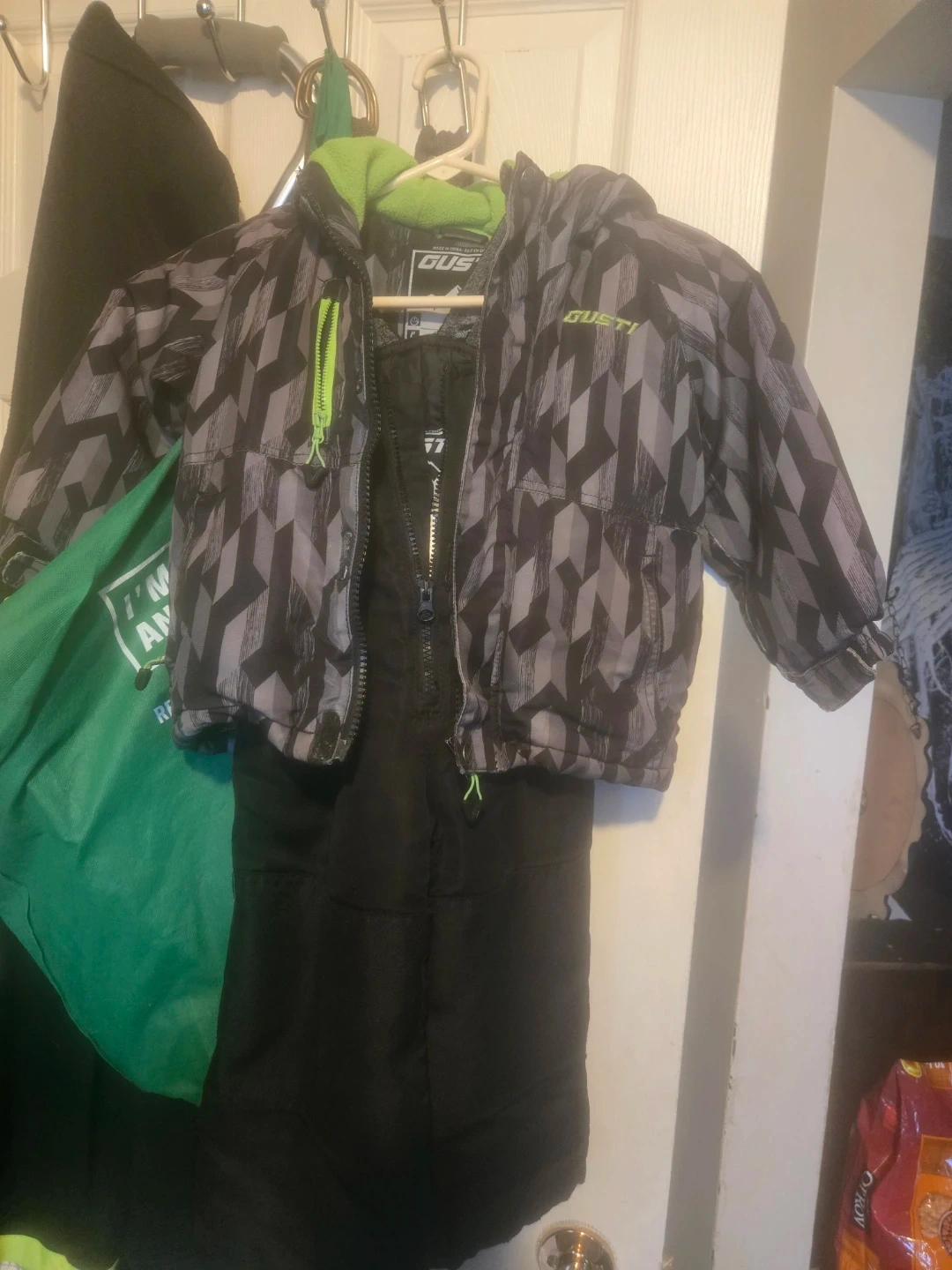 5Selling a Gusti kids' snowsuit. It features a cool geometric pattern on the jacket and solid black snow pants. Perfect for keeping your little one warm and dry during those snowy Canadian winters!