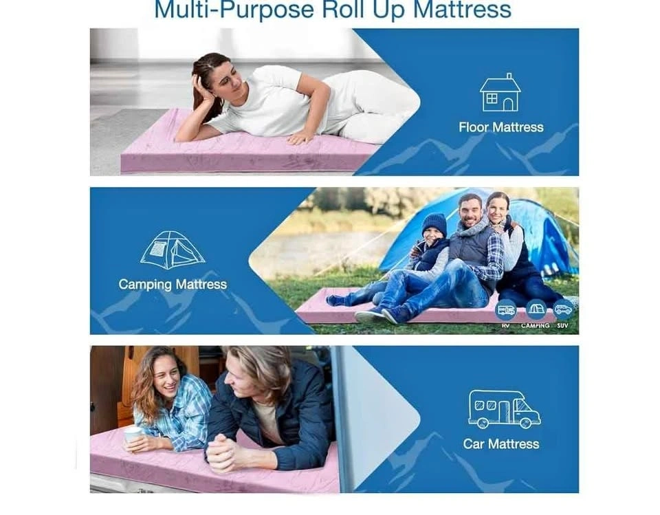 Brand new KingChii CertiPUR-US Memory Foam Camping Mattress. Portable, roll-up design perfect for car camping, travel, or as a guest bed. Includes waterproof cover and travel bag. Dimensions: 72" x 24" x 3". Small Single size.