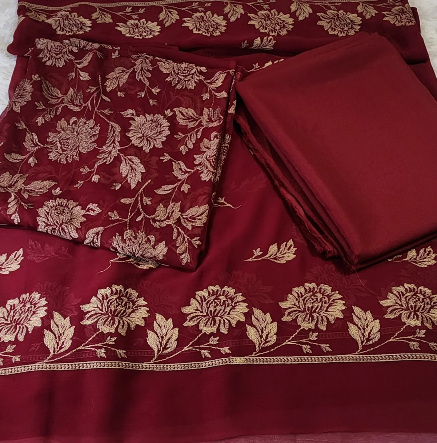 Beautiful embroidered chiffon Suits with intricate thread work Includes a matching solid coloured fabric for the bottom or sleeves.Full lining included , Intricate floral pattern with gold-toned embroidery. Perfect for your next outfit !
