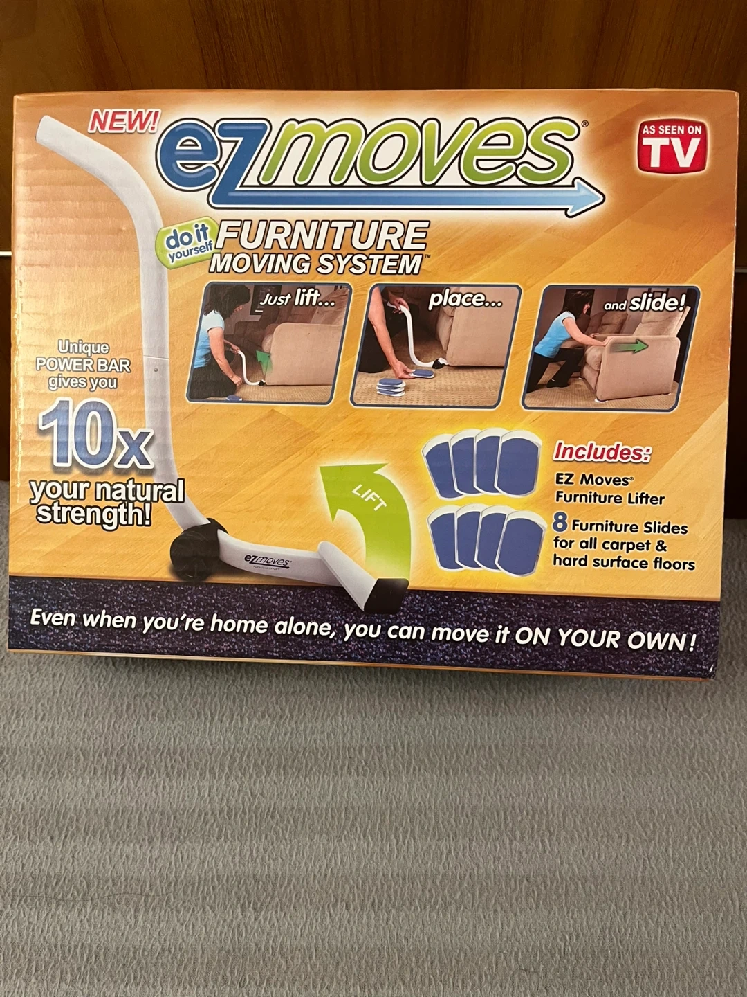 Move your furniture with ease using the EZ Moves Furniture Moving System! This set includes the EZ Moves Furniture Lifter and 8 furniture slides suitable for both carpet and hard surface floors. The unique power bar gives you 10x your natural strength, making it easy to lift, place, and slide furniture all by yourself. Perfect for anyone looking to rearrange their space!