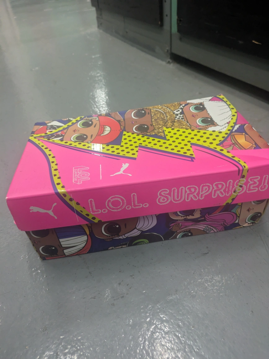 Selling a pair of Puma Future Rider sneakers in collaboration with LOL Surprise! They are in good condition and come with the original box. The shoes feature a fun and vibrant design with a white base, leopard print accents, and pink detailing. Perfect for adding a pop of color to your style!