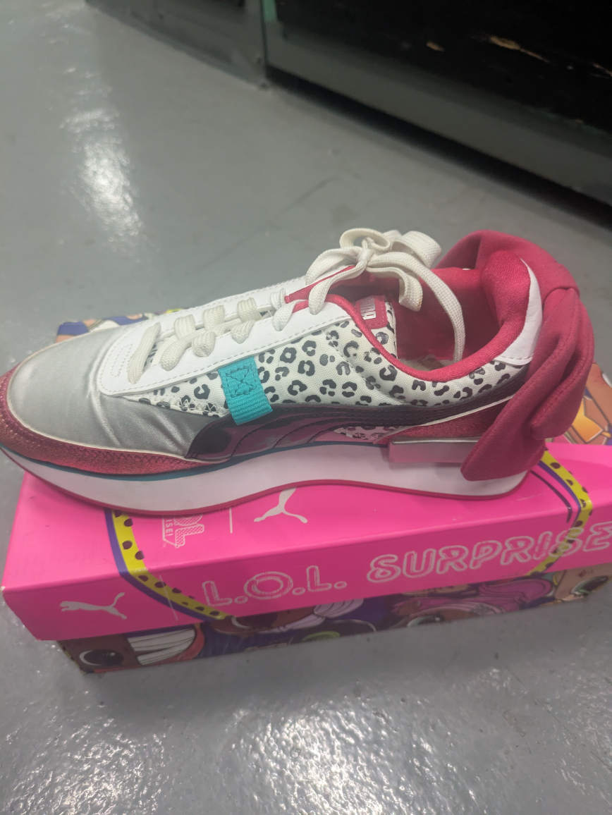 Selling a pair of Puma Future Rider sneakers in collaboration with LOL Surprise! They are in good condition and come with the original box. The shoes feature a fun and vibrant design with a white base, leopard print accents, and pink detailing. Perfect for adding a pop of color to your style!