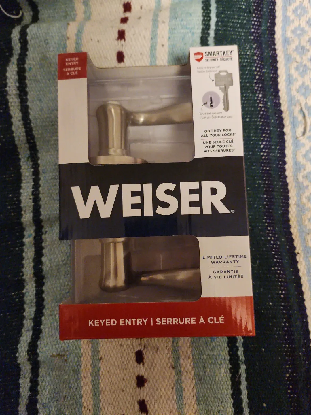 Weiser keyed entry door lever lock. It features SmartKey Security for easy re-keying. This lock comes with a limited lifetime warranty. It's designed for keyed entry and can be used with one key for all your locks.