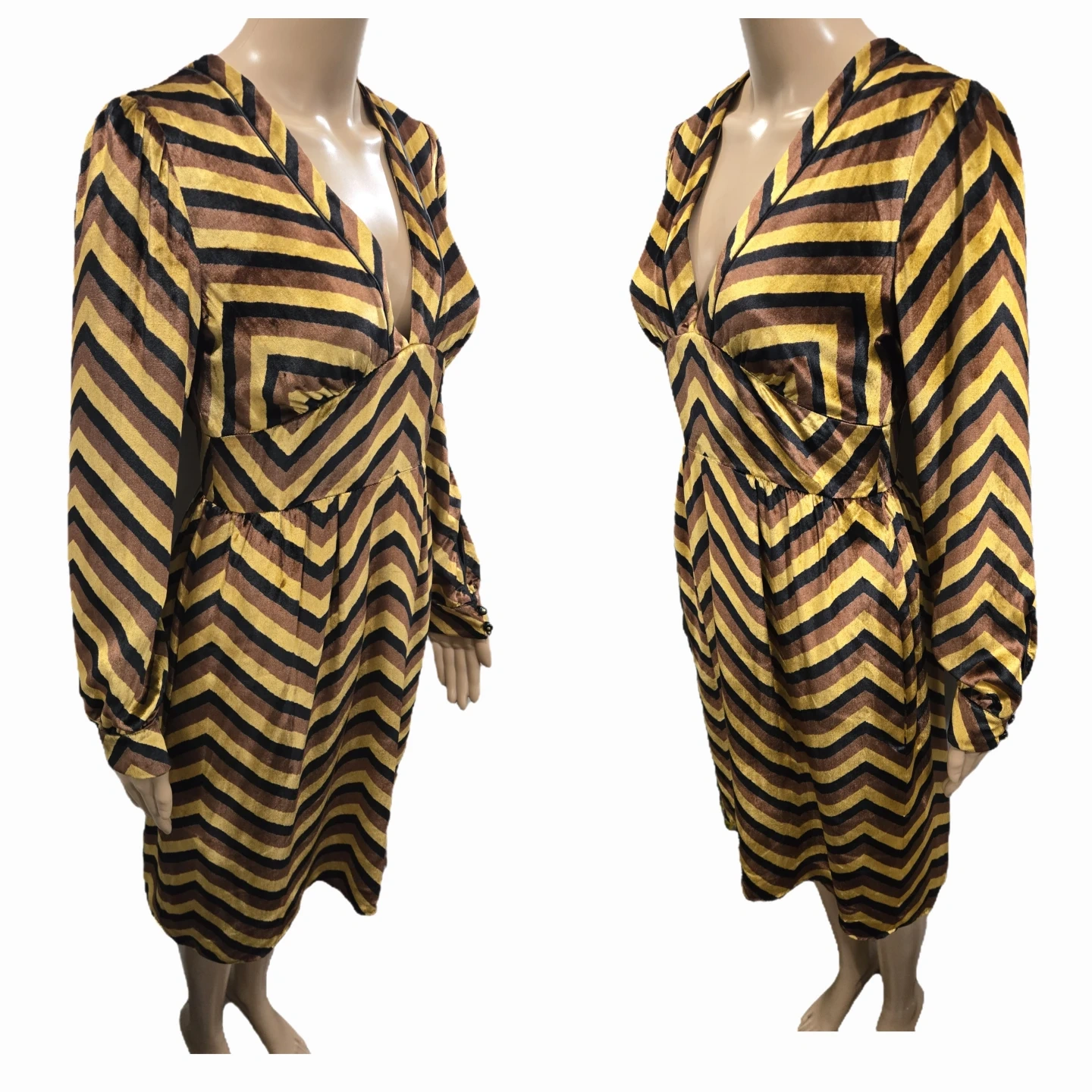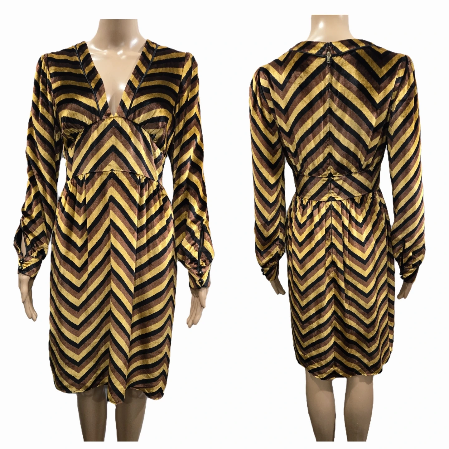 This dress features a striking mix of yellow gold, brown, and black tones with a luxurious texture. The silhouette features a deep V-neckline, long sleeves with buttoned cuffs, and a dramatic exposed back zipper. Fully lined.