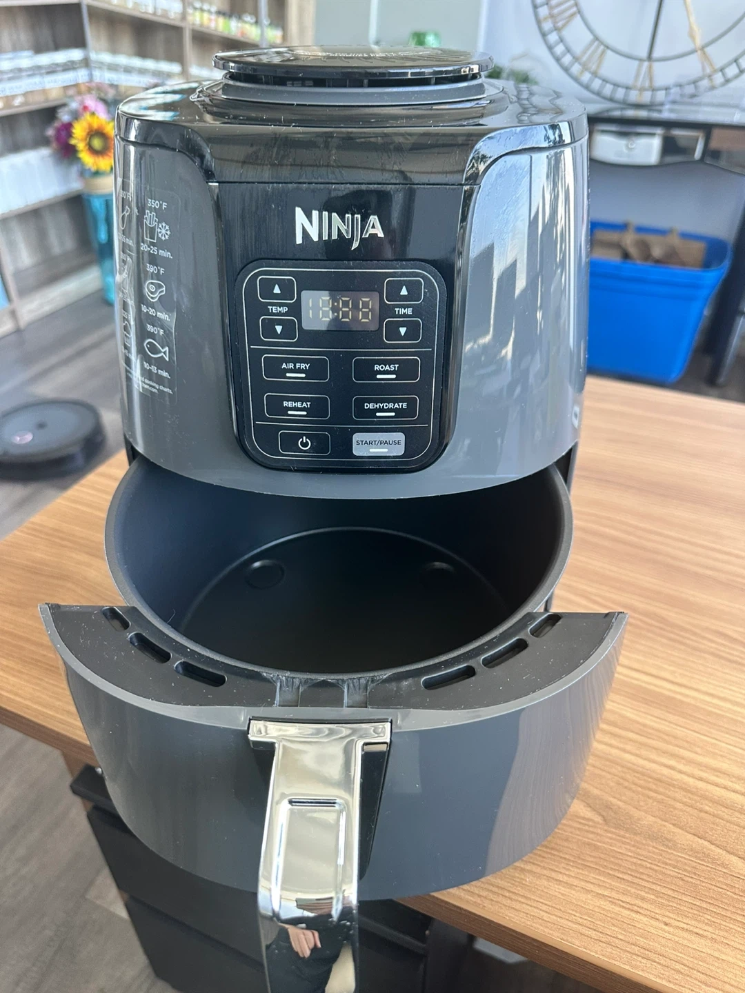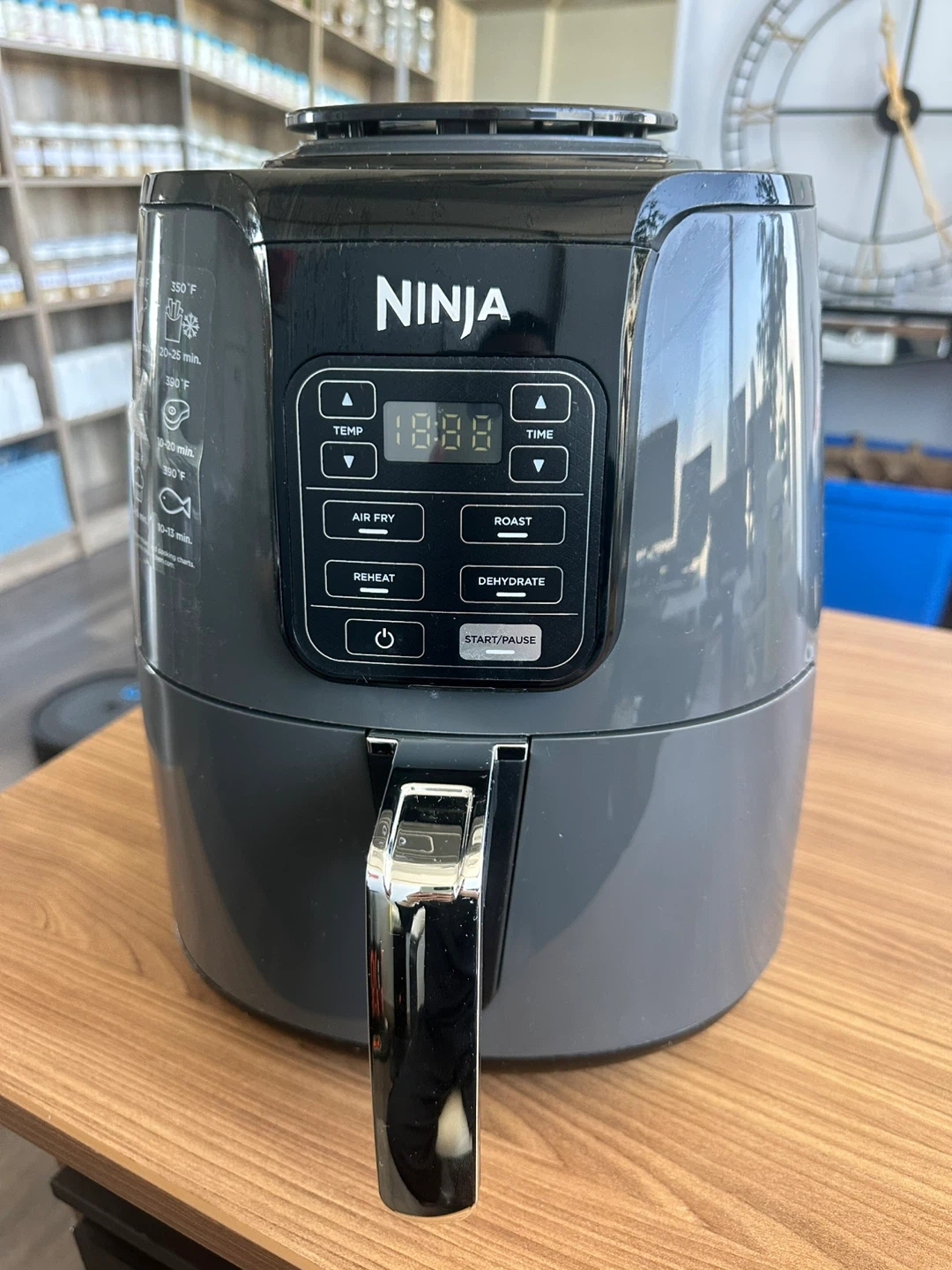 This Ninja Air Fryer is a 120V appliance with a 4-quart capacity. It offers multiple functions like air fry, roast, reheat, and dehydrate. Great for quick meals!