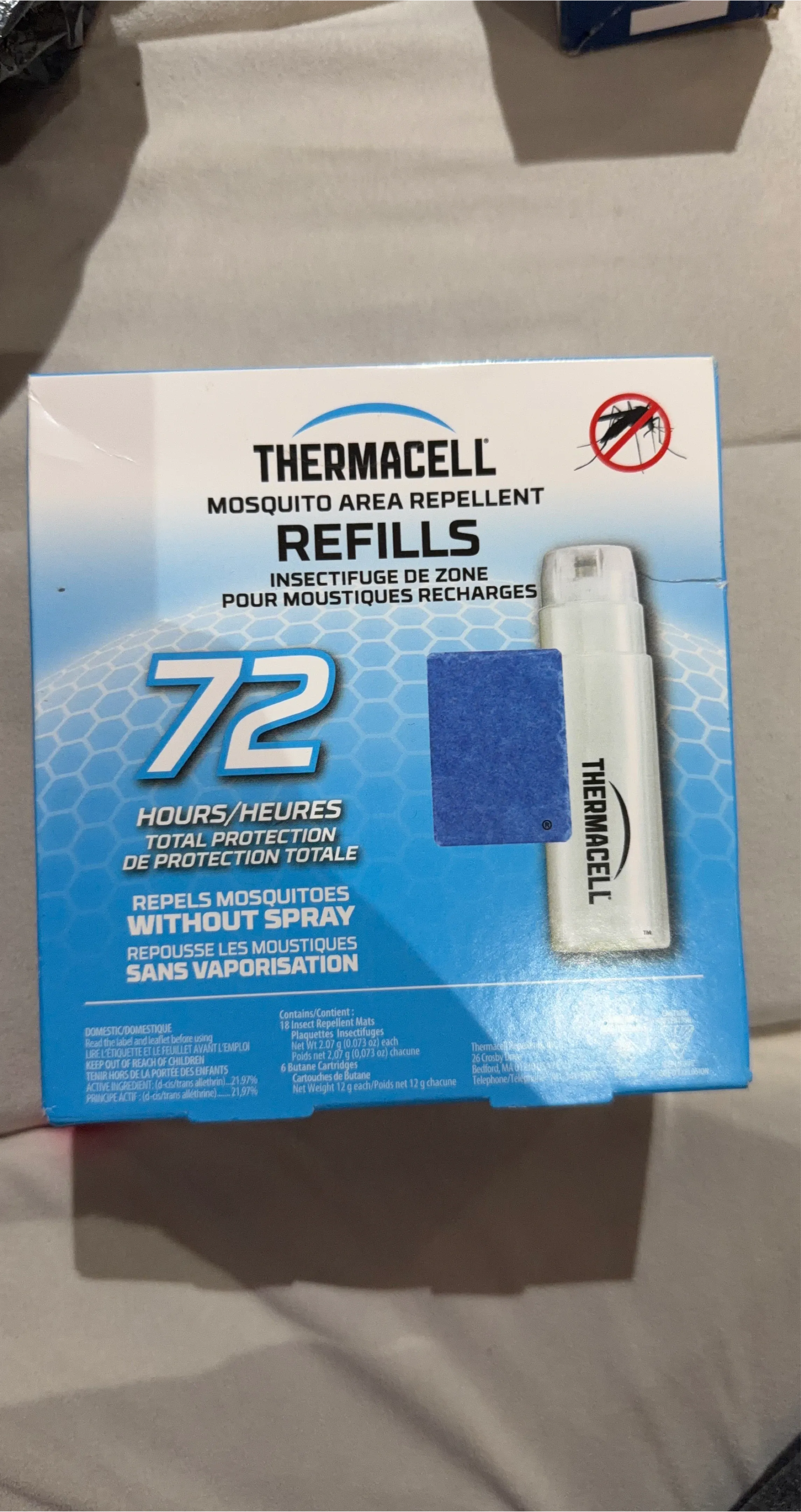 This box contains 18 insect repellent mats and 6 butane cartridges for your Thermacell device. It offers 72 hours of total protection against mosquitoes without spray. Active ingredient is (d-cis/trans allethrin) 21.97%.