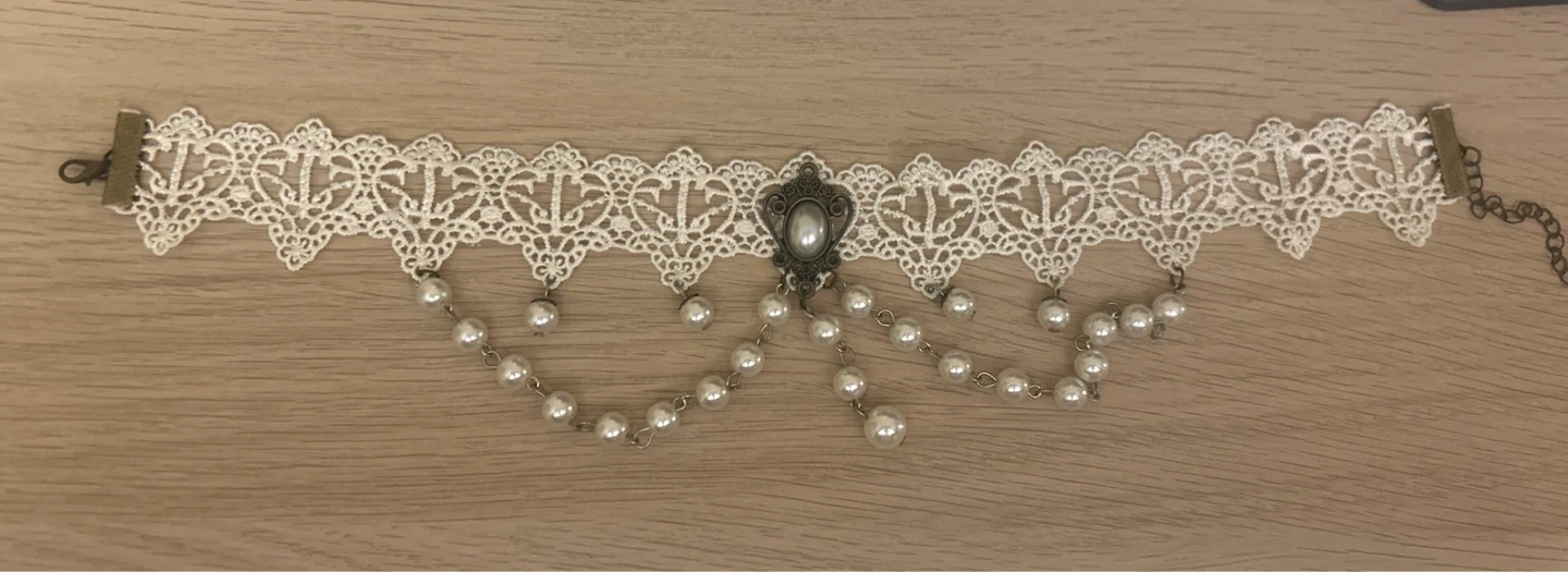 A beautiful white lace choker adorned with faux pearls and a central pendant. It features a delicate floral lace pattern and a lobster clasp closure with an extender chain. This choker is perfect for adding a touch of vintage charm to any outfit!