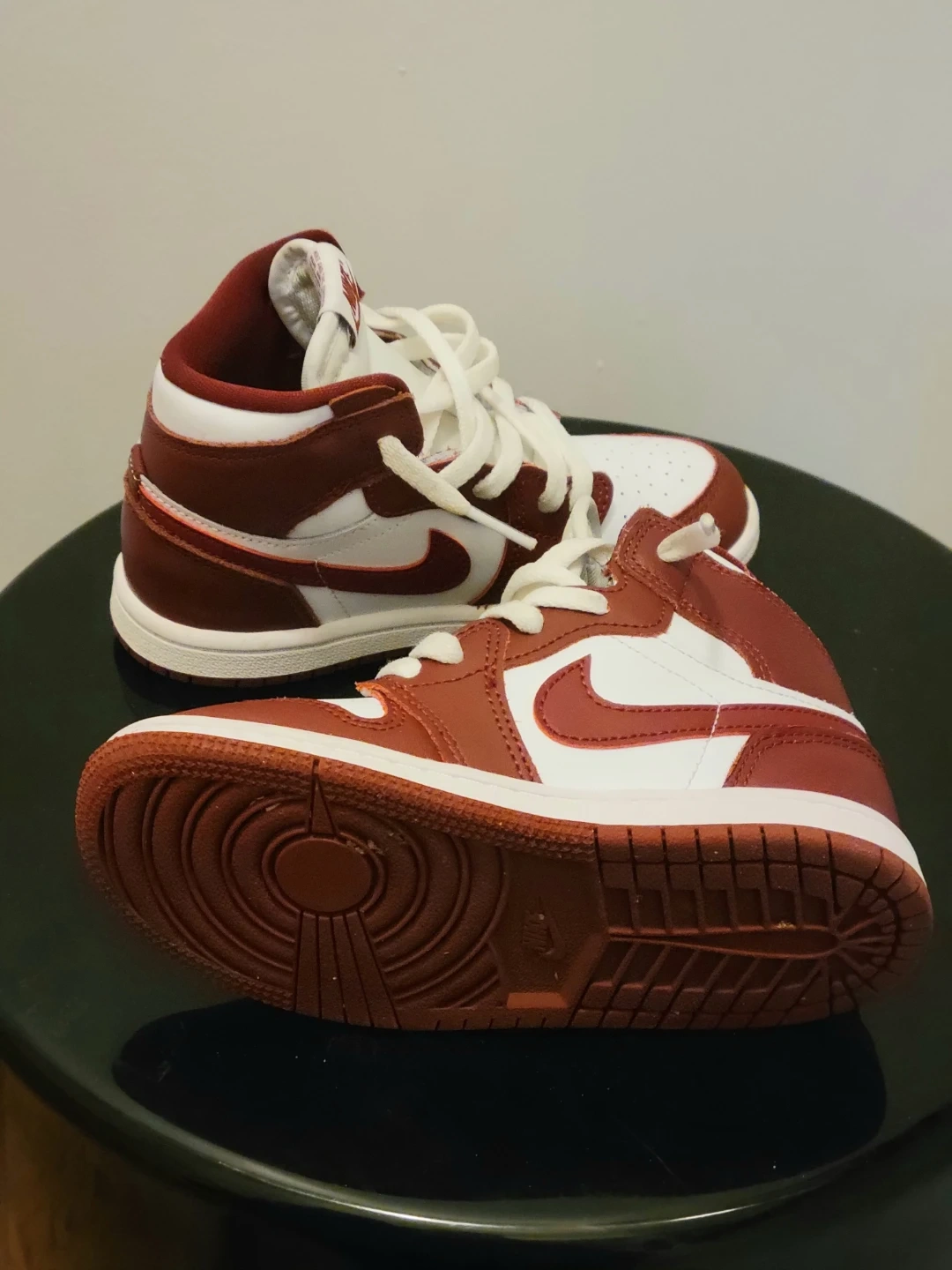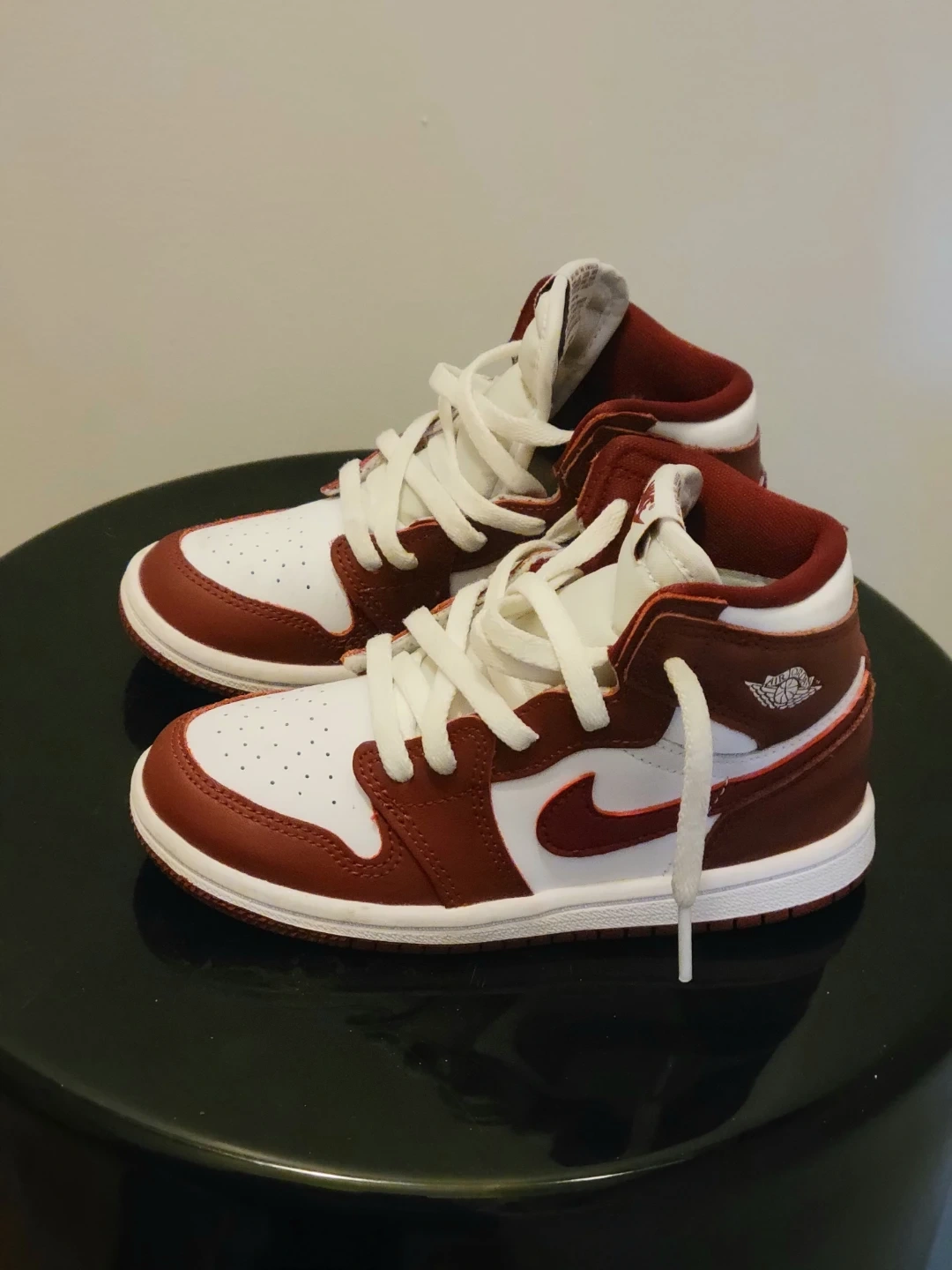 These Nike Air Retro Jordan 1 Mid sneakers are in a classic white and burgundy colourway. They feature a lace-up closure and iconic Jordan branding. Perfect for everyday wear! Son only wore once for his birthday. Size 10