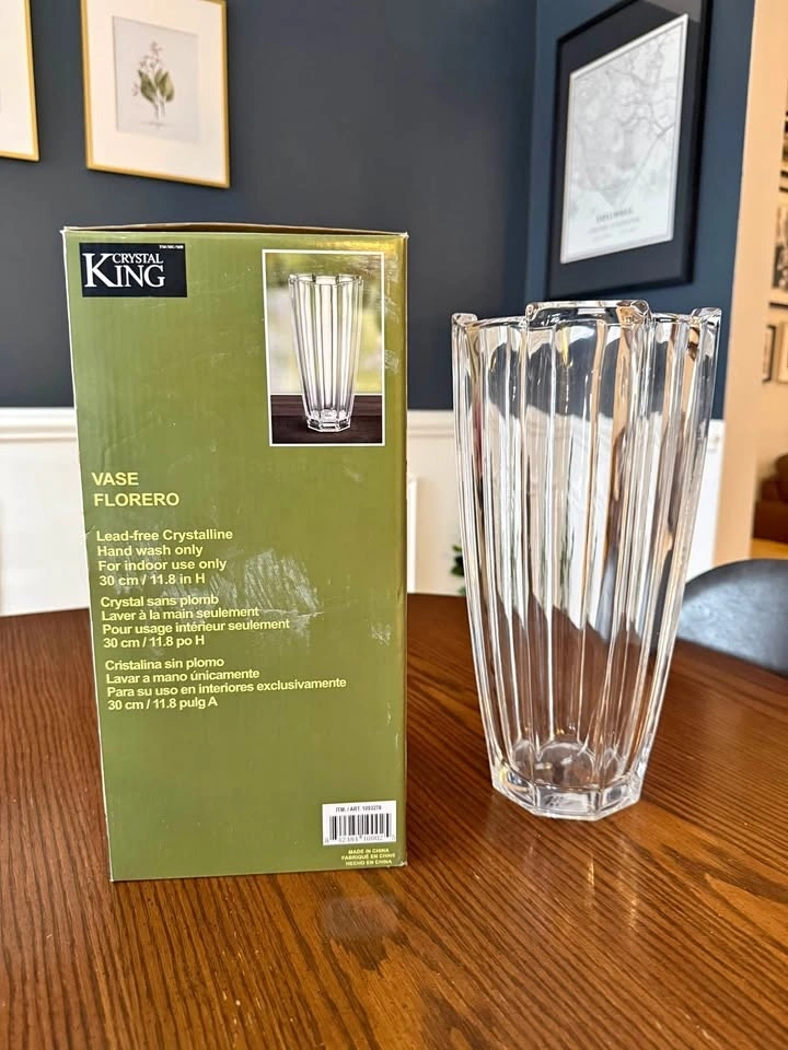 Beautiful brand new crystal decorative flower vase, still in the original box. Perfect for fresh bouquets, artificial flowers, or as a standalone centerpiece. Tall and sturdy, making it ideal for roses, lilies, or larger floral arrangements. Looks great on dining tables, entry tables, mantels, or office spaces. Brand: Crystal King. Material: Lead-free crystalline glass. Height: 30 cm / 11.8 inches. Condition: Brand new in box.