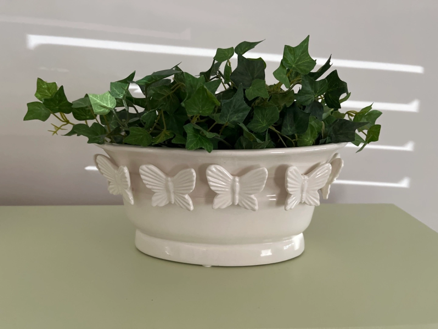 This is a lovely white decorative bowl featuring butterfly accents, perfect for adding a touch of charm to any room.