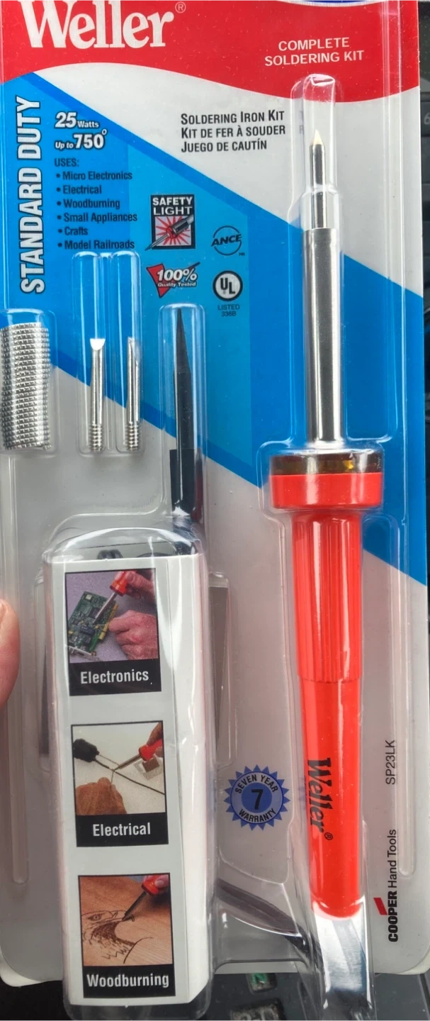 Brand new! This Weller soldering iron kit is 25 Watts and complete. It's suitable for micro electronics, electrical work, woodburning, and model railroads. It includes multiple tips and a seven-year warranty.