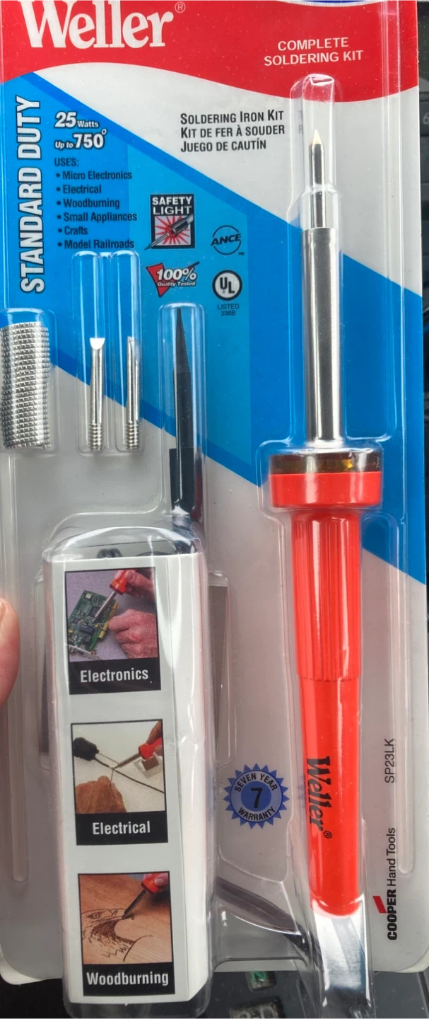 Brand new! This Weller soldering iron kit is 25 Watts and complete. It's suitable for micro electronics, electrical work, woodburning, and model railroads. It includes multiple tips and a seven-year warranty.