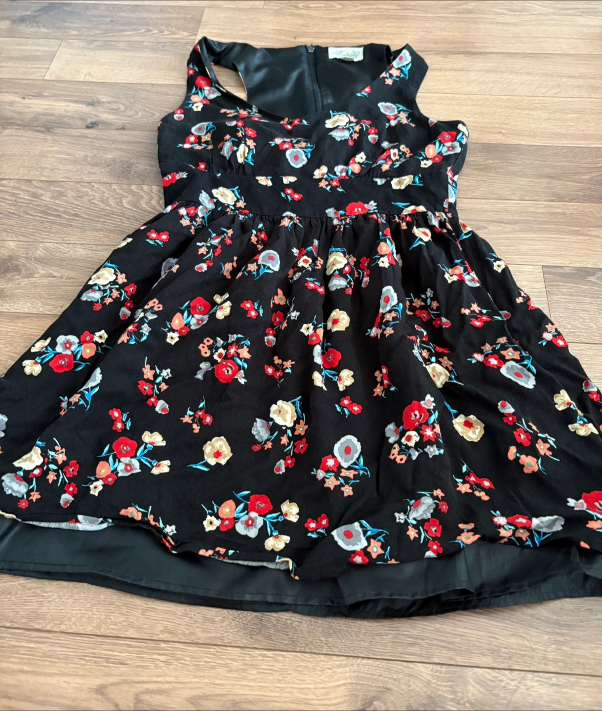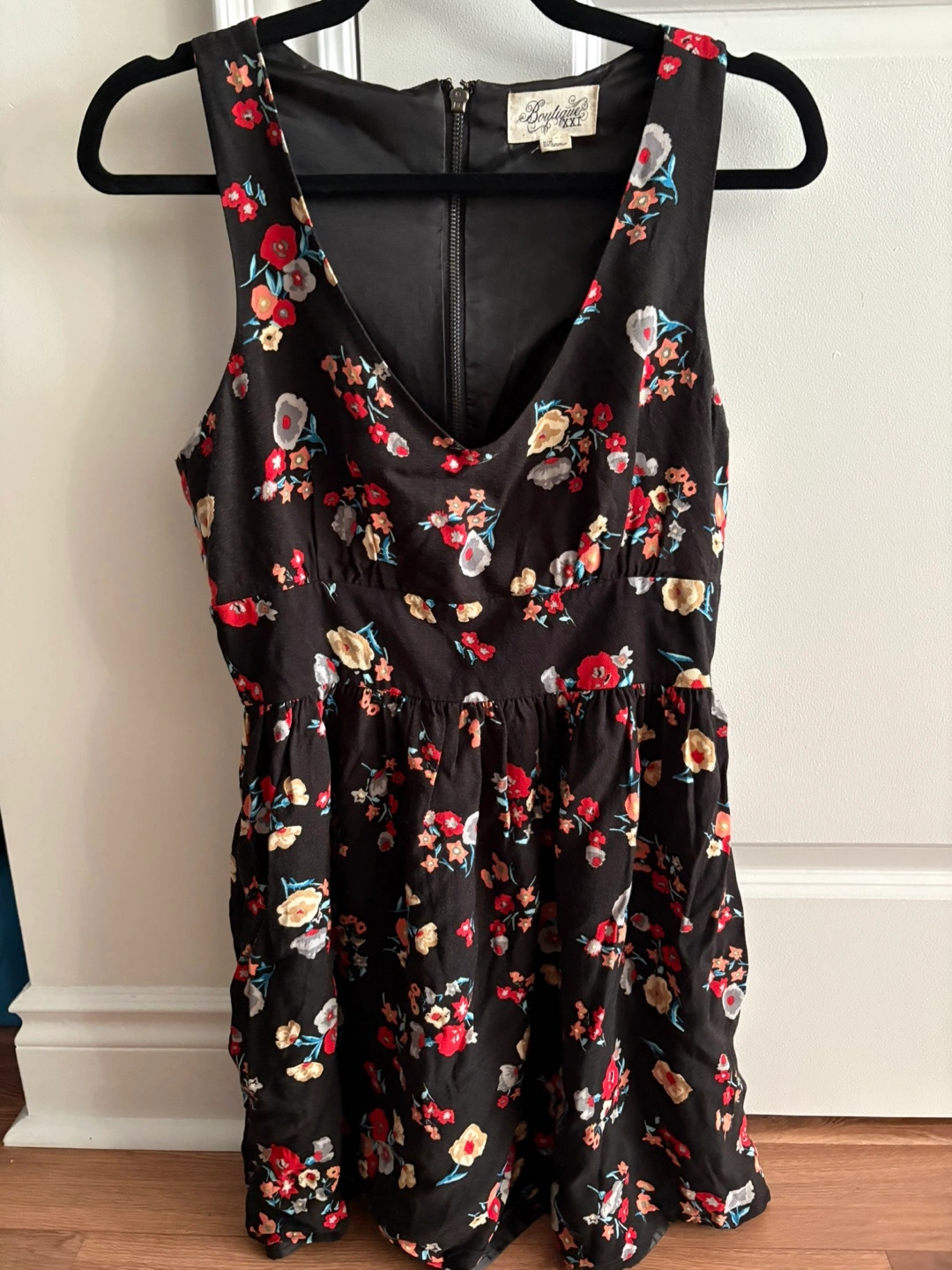 Here's a cute black floral dress from Boulevard! It's a size medium, but I would say it fits more like small to medium. Great condition. Perfect for a casual day out or a summer party