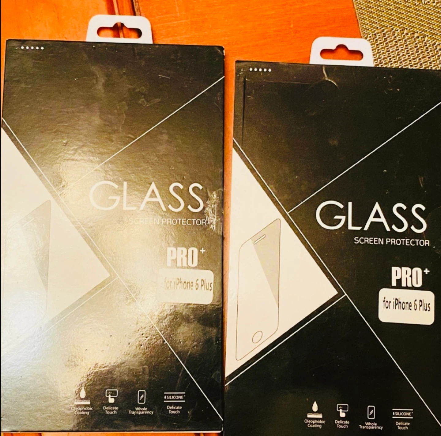 Two brand new glass screen protectors. Designed for the iPhone 6 Plus. Features oleophobic coating, delicate touch, and whole transparency. Includes silicone adhesive.