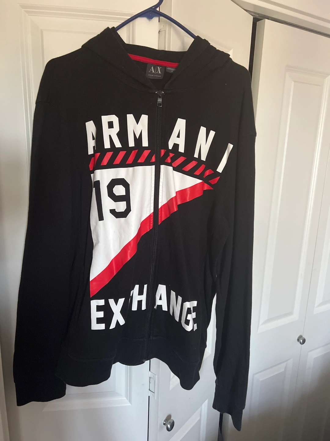 Men's black zip-up hoodie. Features red and white graphic design. Long sleeves, hooded.