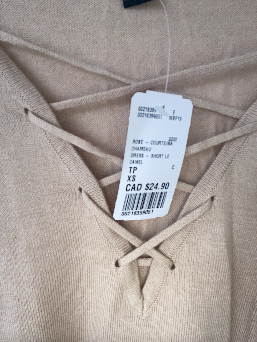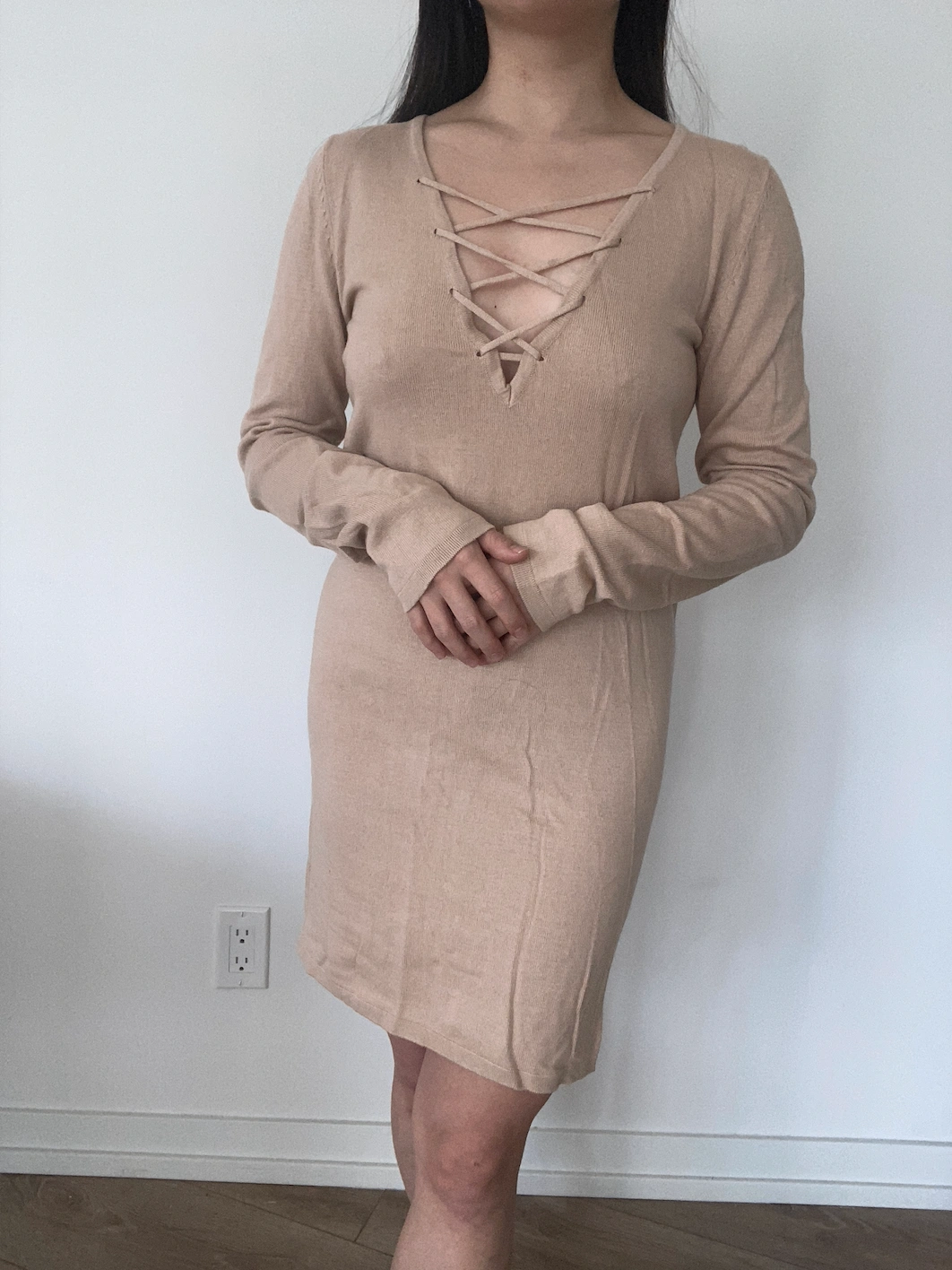 beige/taupe sweater dress with criss-cross down the front