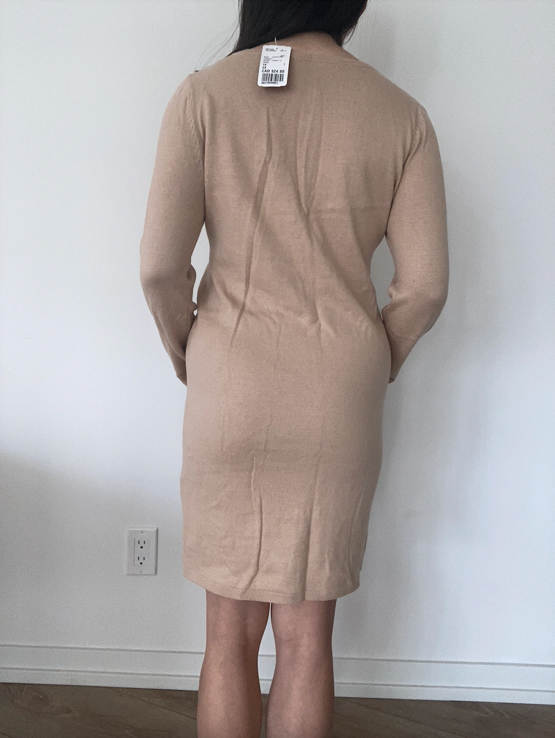 beige/taupe sweater dress with criss-cross down the front