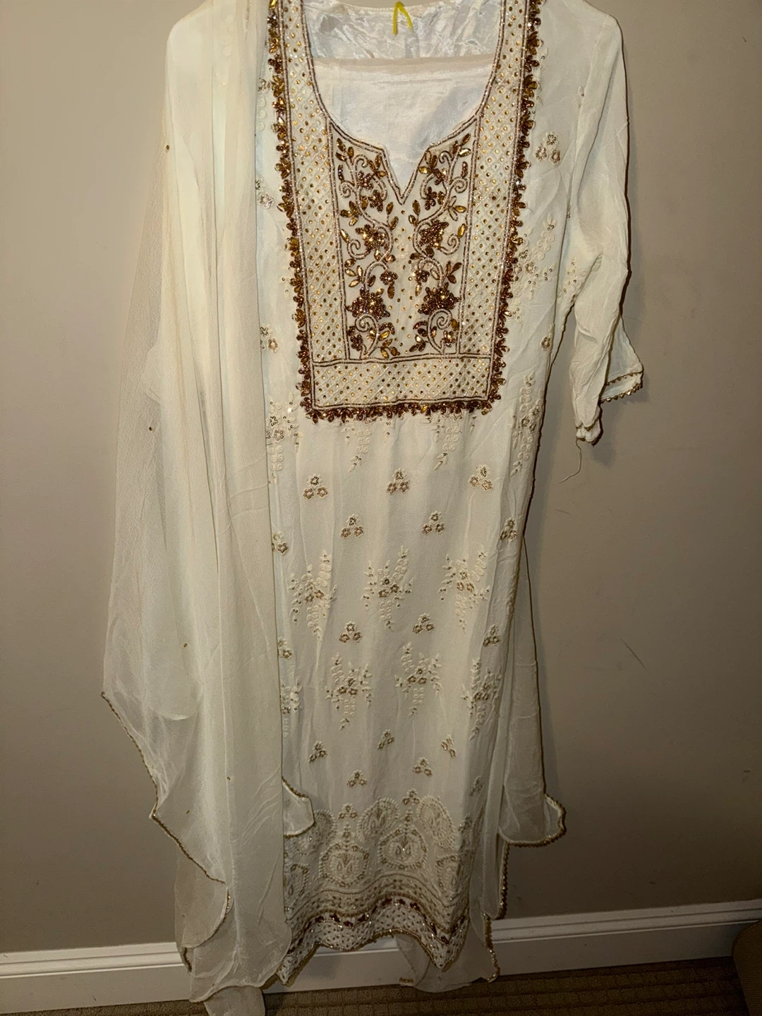 Beautiful white and gold Indian dress. Has intricate embroidery on neckline, sleeves, and bottom hem. Comes with matching sheer dupatta with gold trim. Great for parties or special events. It comes with bottom white color pants. I have just worn it for few hours on an occasion never worn after that. Dry cleaned and kept.