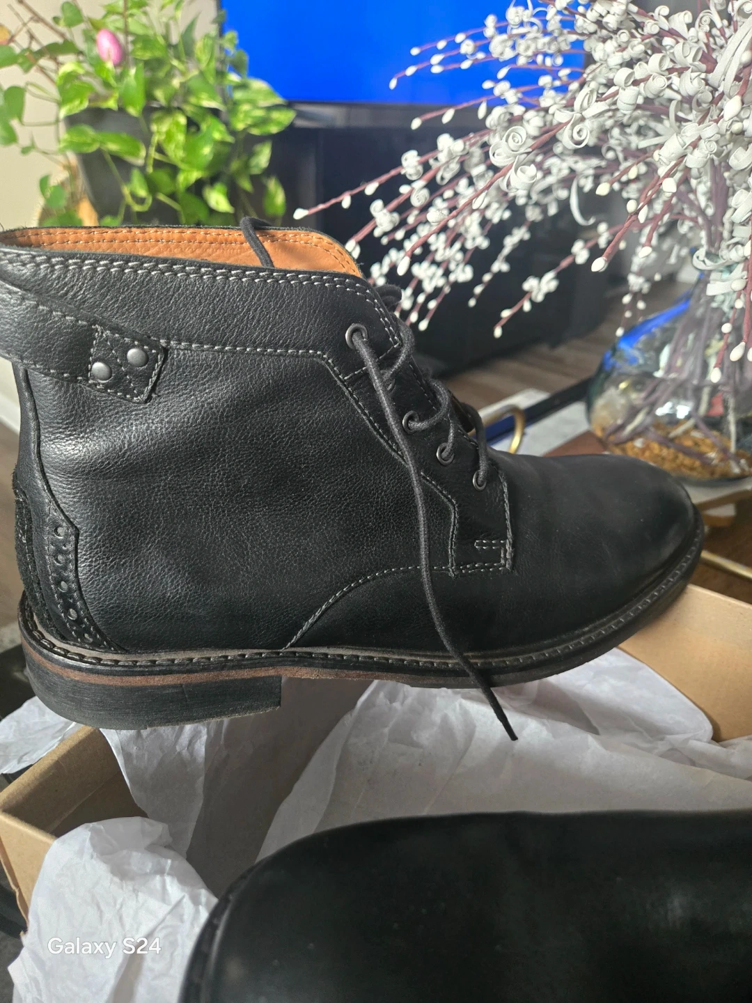These Clarks chukka boots are made with black leather. They have a lace-up closure and a durable sole. A great casual boot for everyday wear!