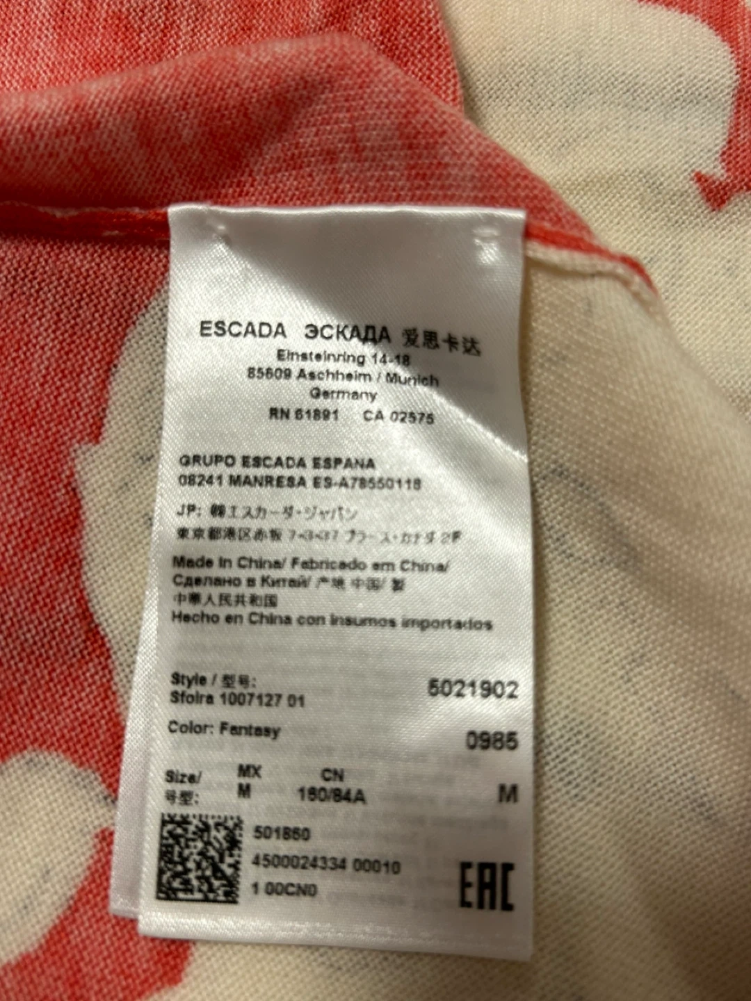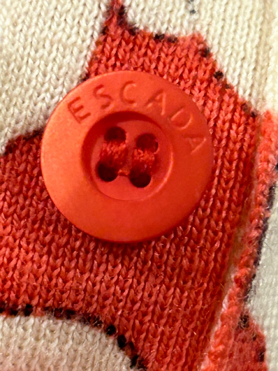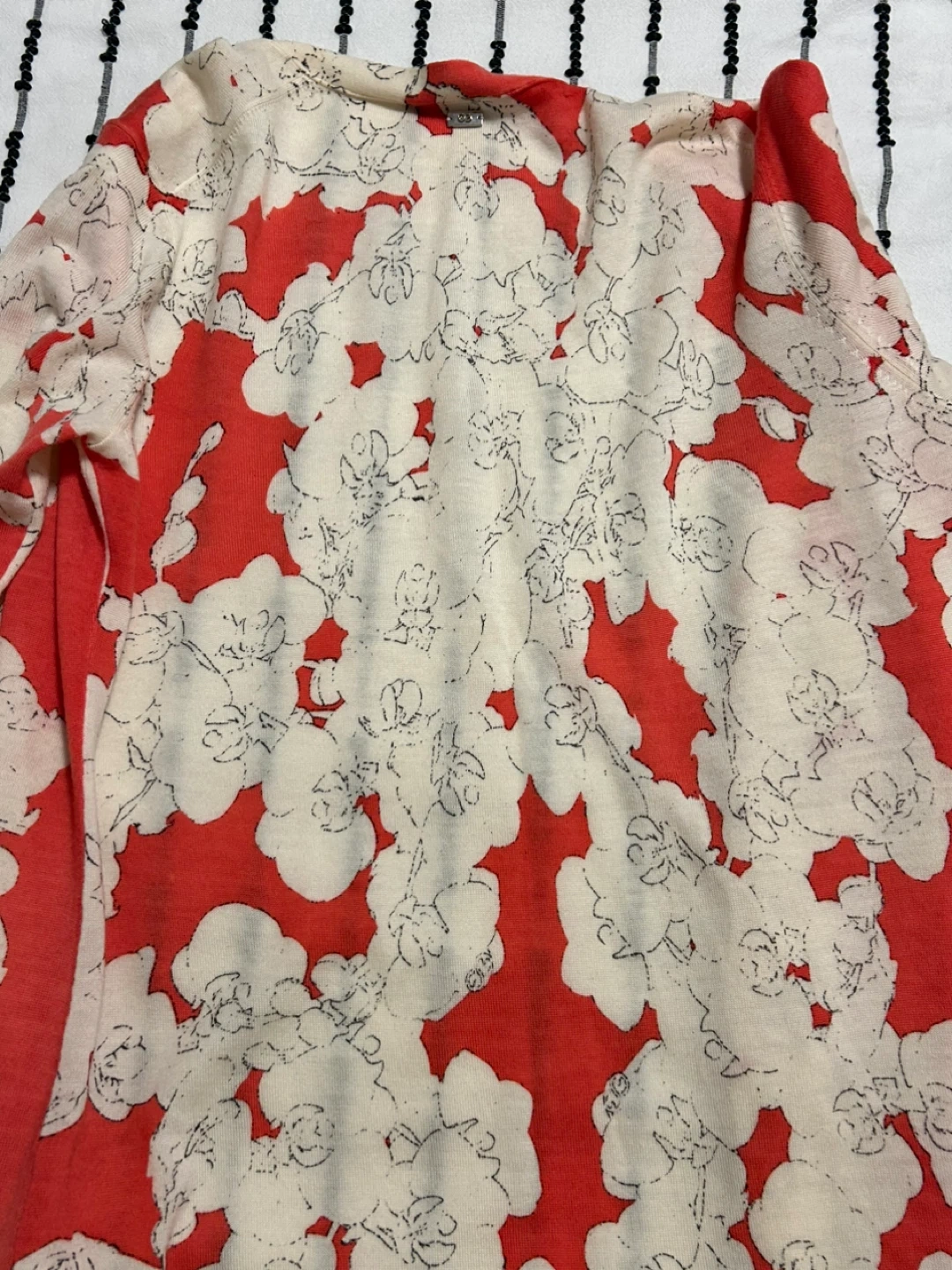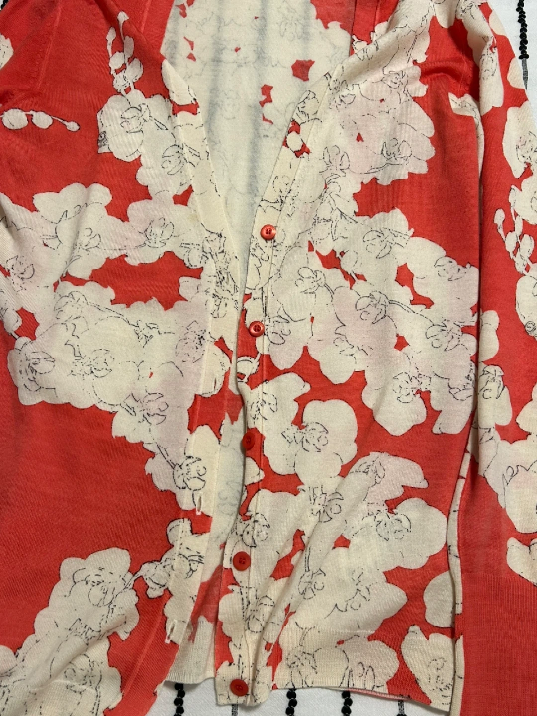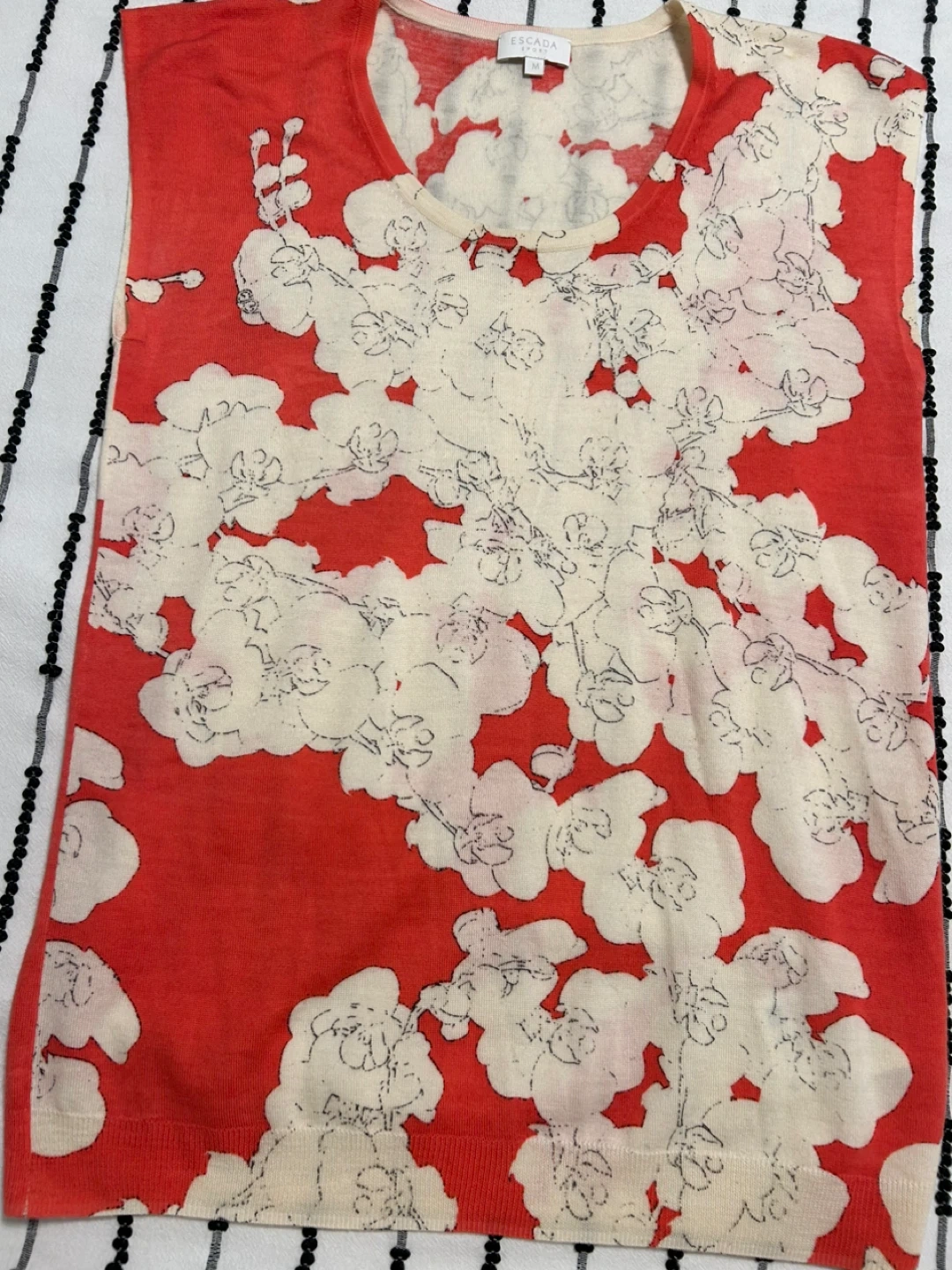 Escada Sport two-piece set featuring a coral red and cream floral print. It's a sleeveless tank top and a matching long-sleeved cardigan. Size is medium.