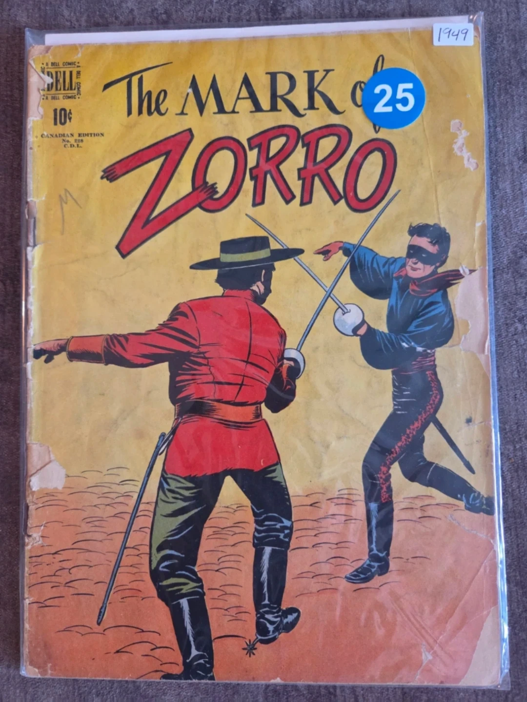 This is The Mark of Zorro comic book, issue #228. It's a Canadian Edition published by Dell Comics in 1949. The cover shows a duel between Zorro and another character. Some wear is visible on the cover's edges.