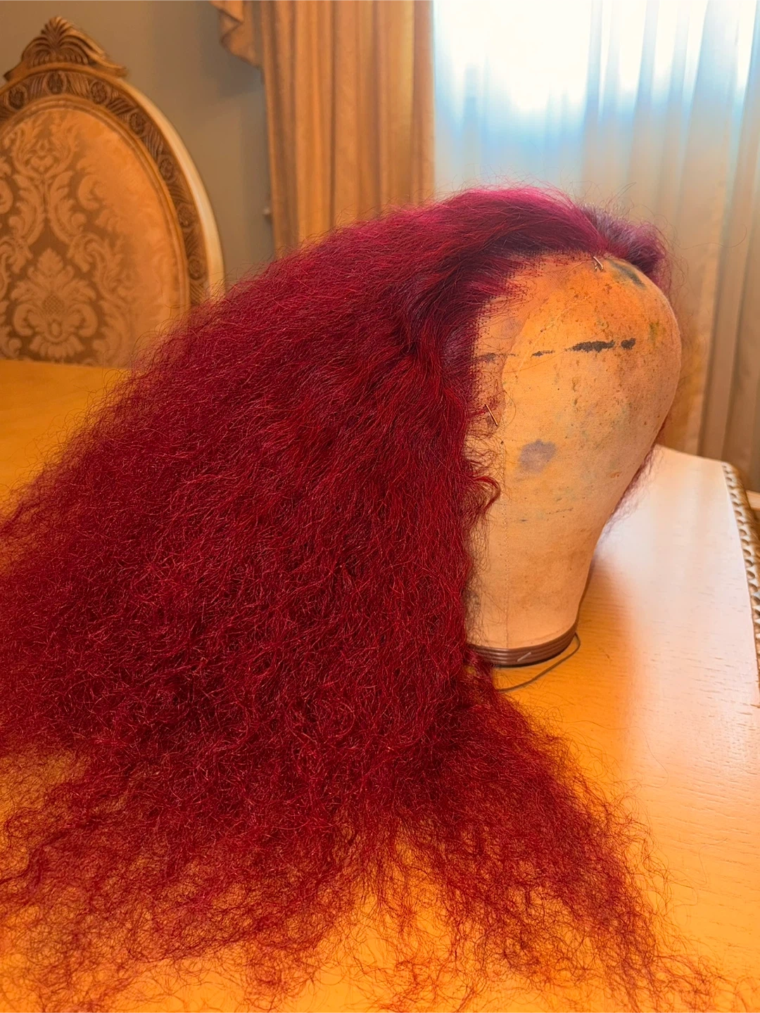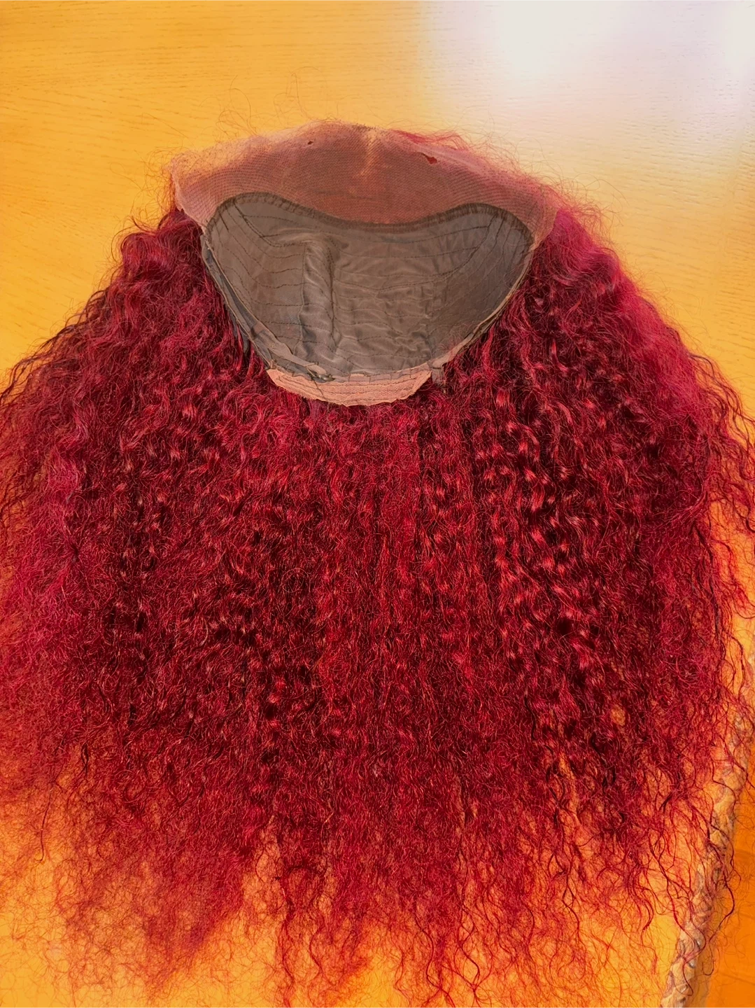 Beautiful 99J burgundy kinky curly lace front wig with 13x4 HD lace for a natural, seamless hairline.