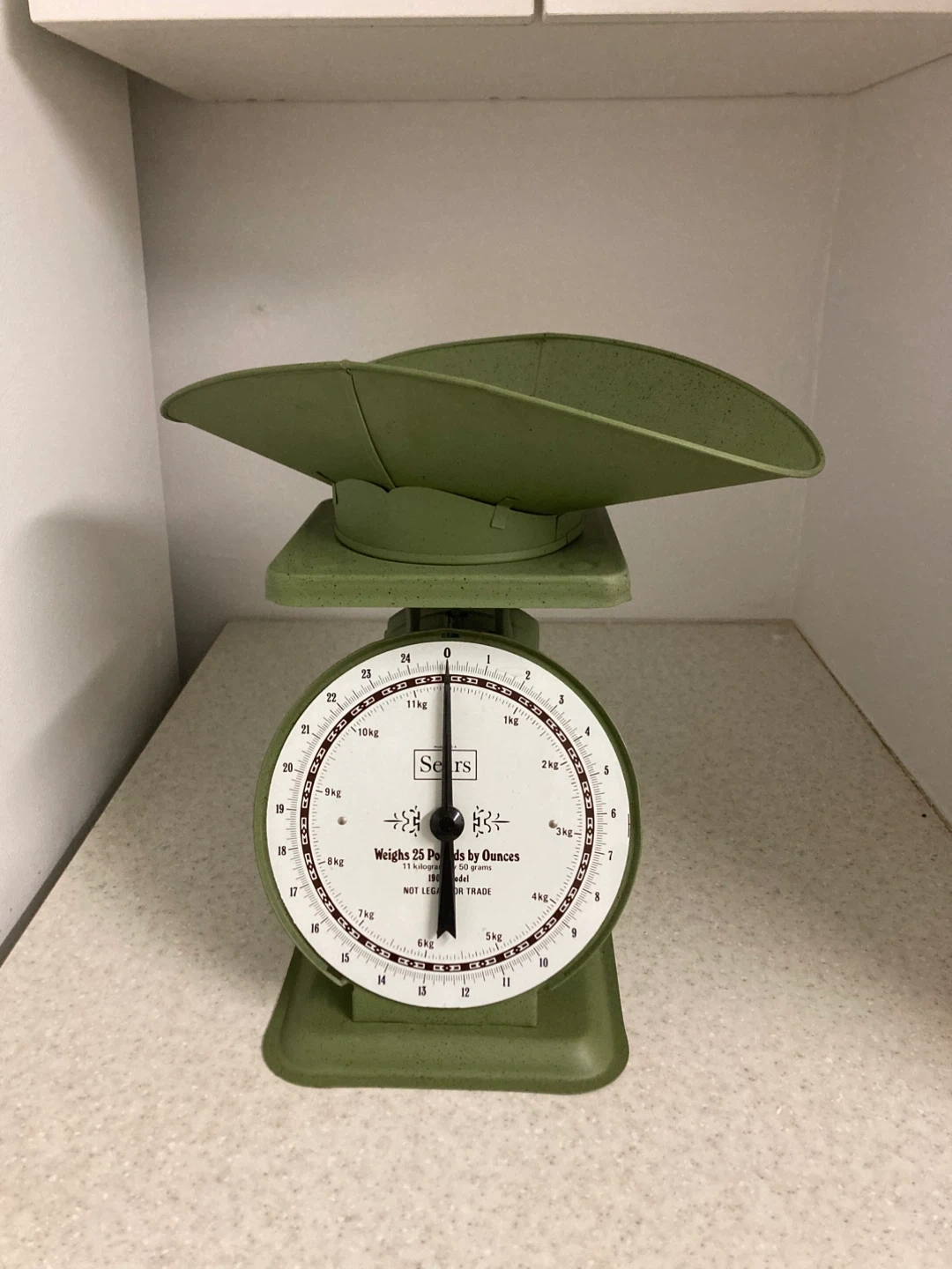 Selling a vintage Sears kitchen scale in avocado green! It weighs in both pounds and ounces, as well as kilograms. Perfect for adding a touch of retro charm to your kitchen.