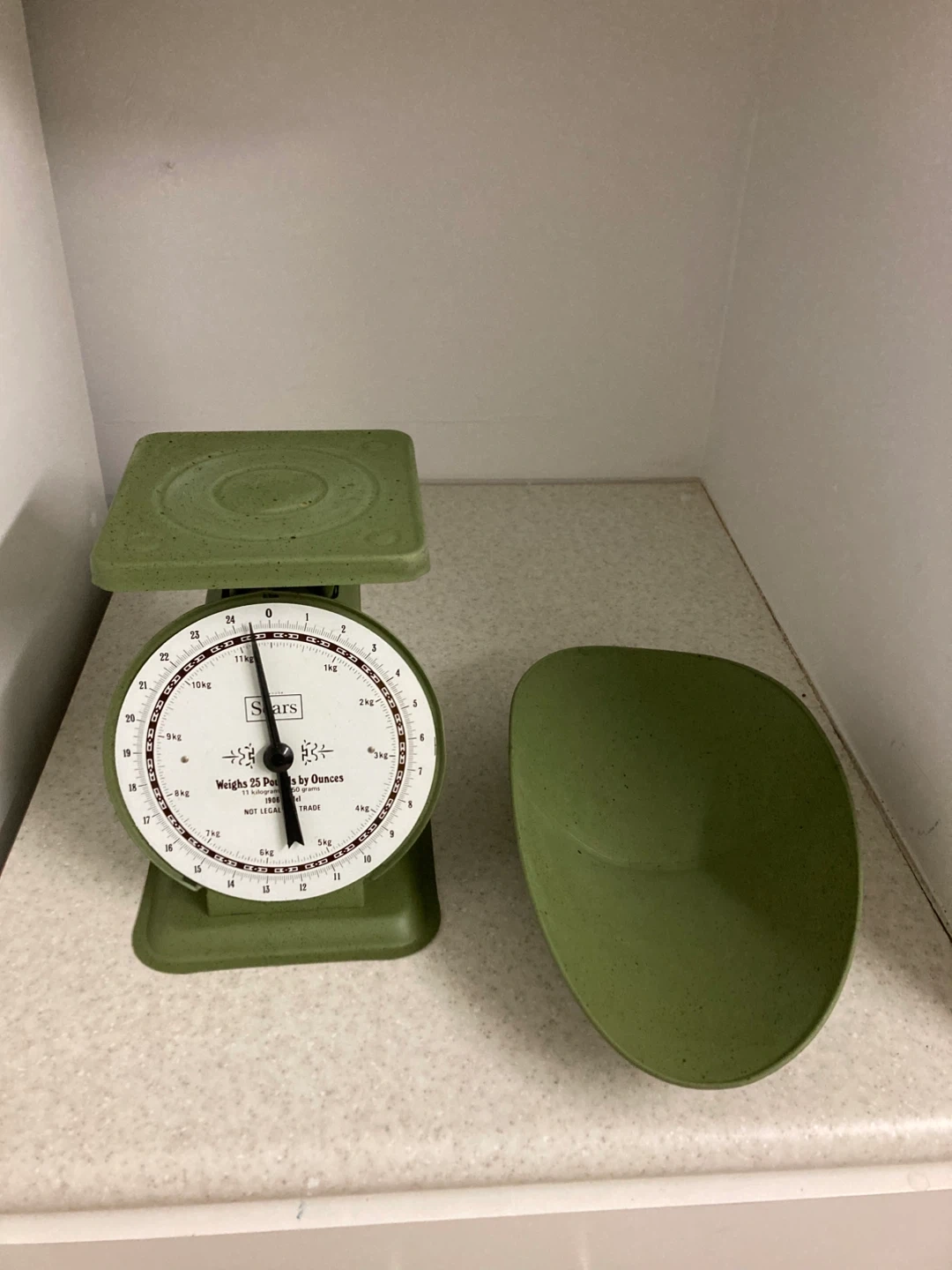 Selling a vintage Sears kitchen scale in avocado green! It weighs in both pounds and ounces, as well as kilograms. Perfect for adding a touch of retro charm to your kitchen.