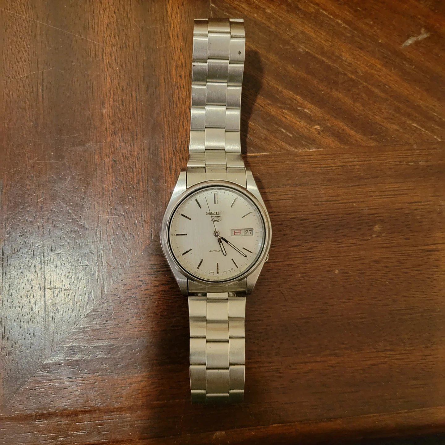 This Seiko 5 watch features a stainless steel band and case. It's an automatic movement with a day and date display. The watch has a silver dial.