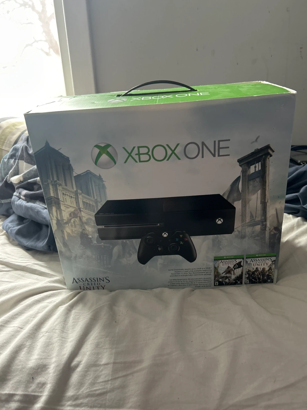 This is an Xbox One console, originally released with Assassin's Creed Unity. It comes with a variety of games including Call of Duty, Halo, and Forza. White controllers instead of black.