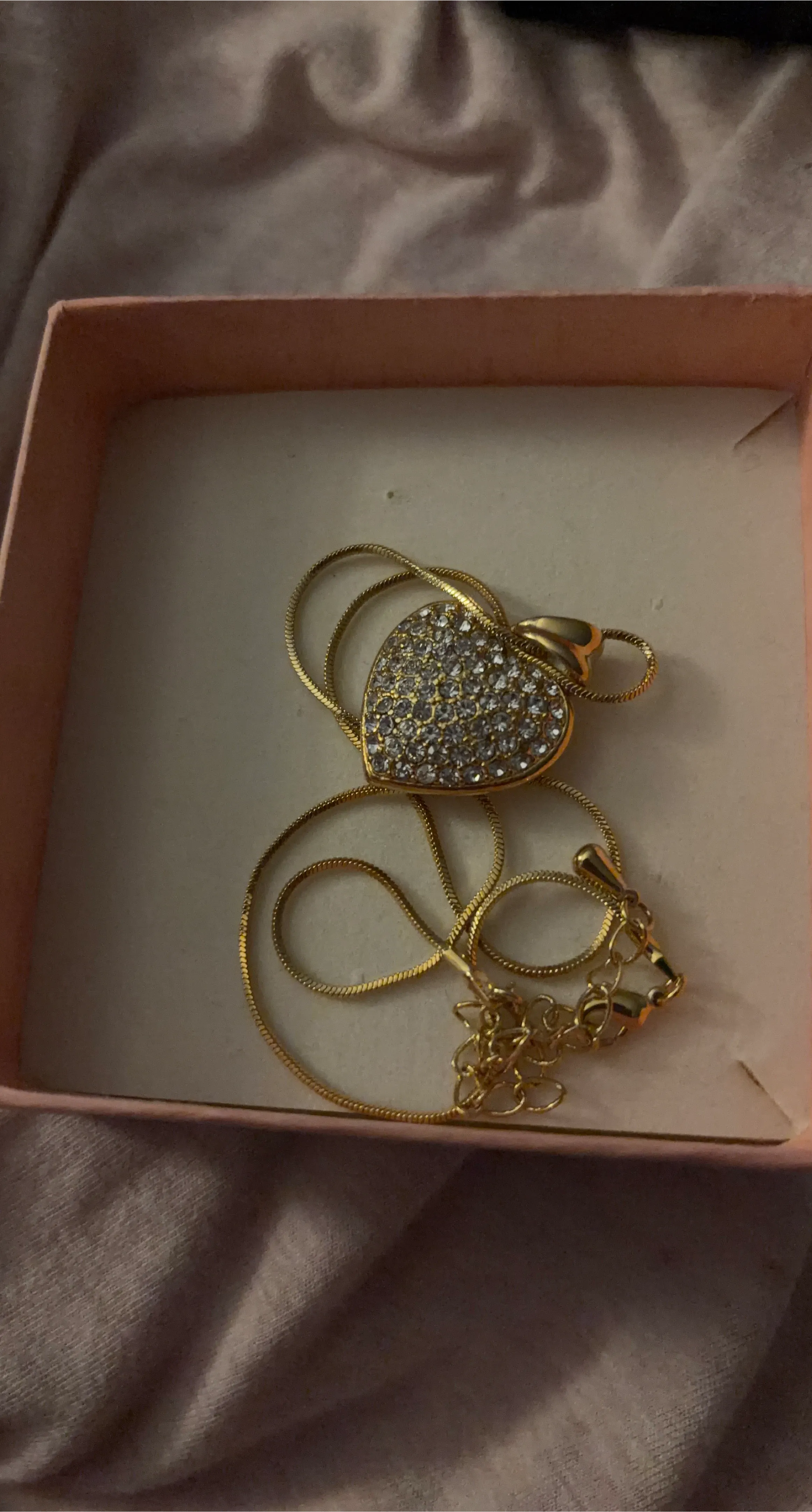 Selling a beautiful gold heart pendant necklace. It comes in a box, perfect for gifting or keeping it safe. The heart is covered in sparkly stones, making it a lovely accessory for any outfit!