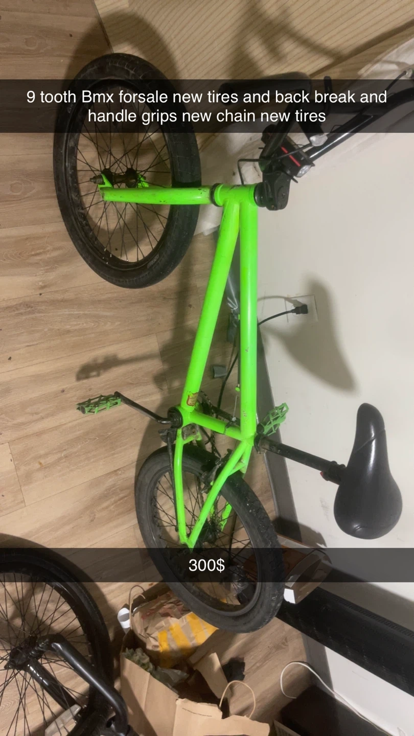 This is a green BMX bike with a 9-tooth setup. It features new tires, a new chain, new handle grips, and a back brake. It's ready to ride for some fun!
