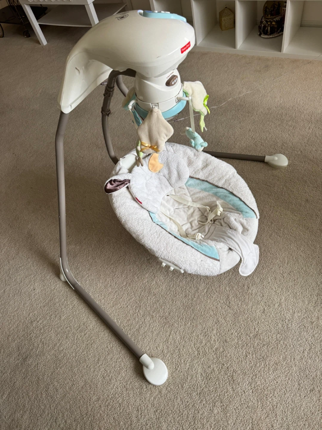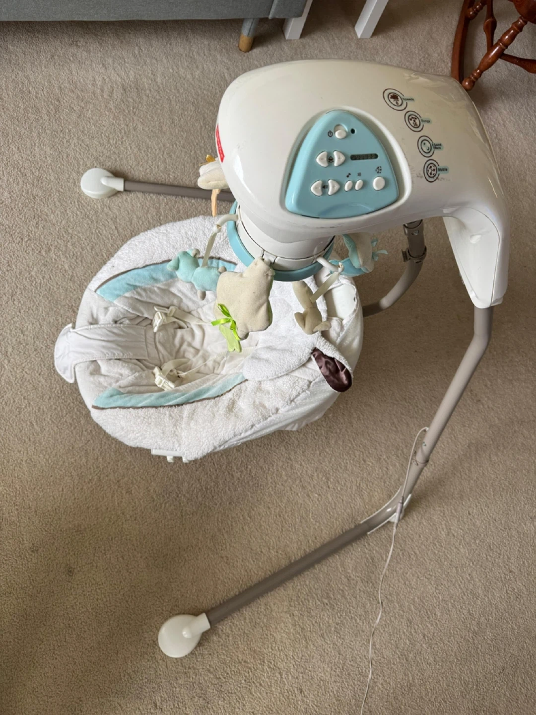 Fisher-Price baby swing in white and blue. It has multiple speed settings and music options. The seat pad is soft and removable for cleaning. This swing is great for soothing a fussy baby!