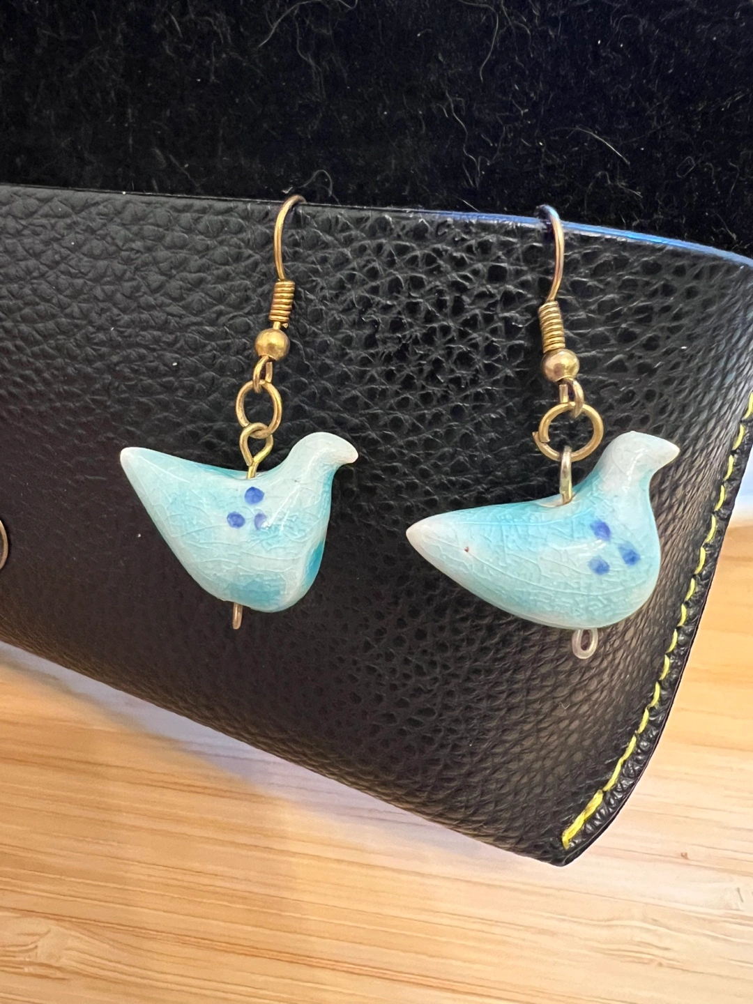 Cute pair of blue ceramic bird earrings! They have a unique design with small blue dots.