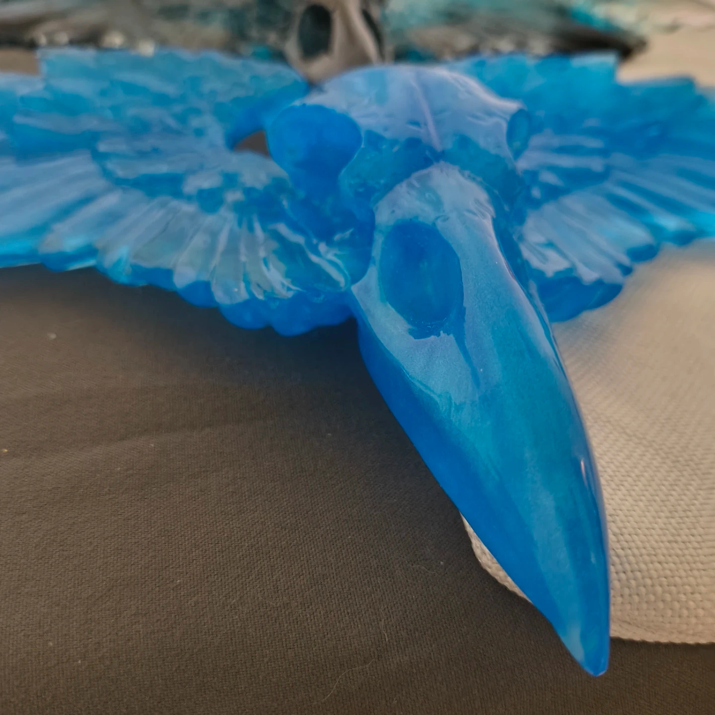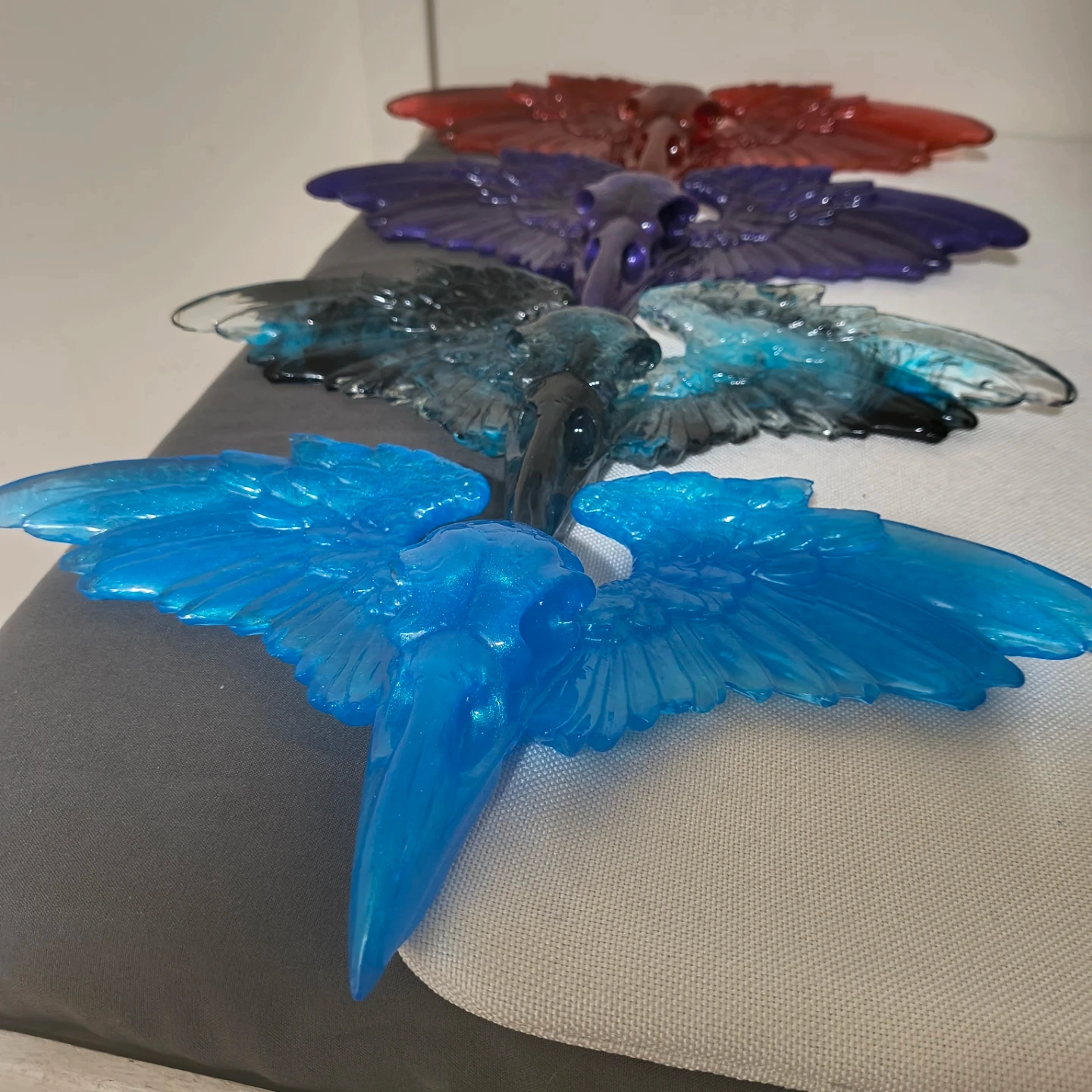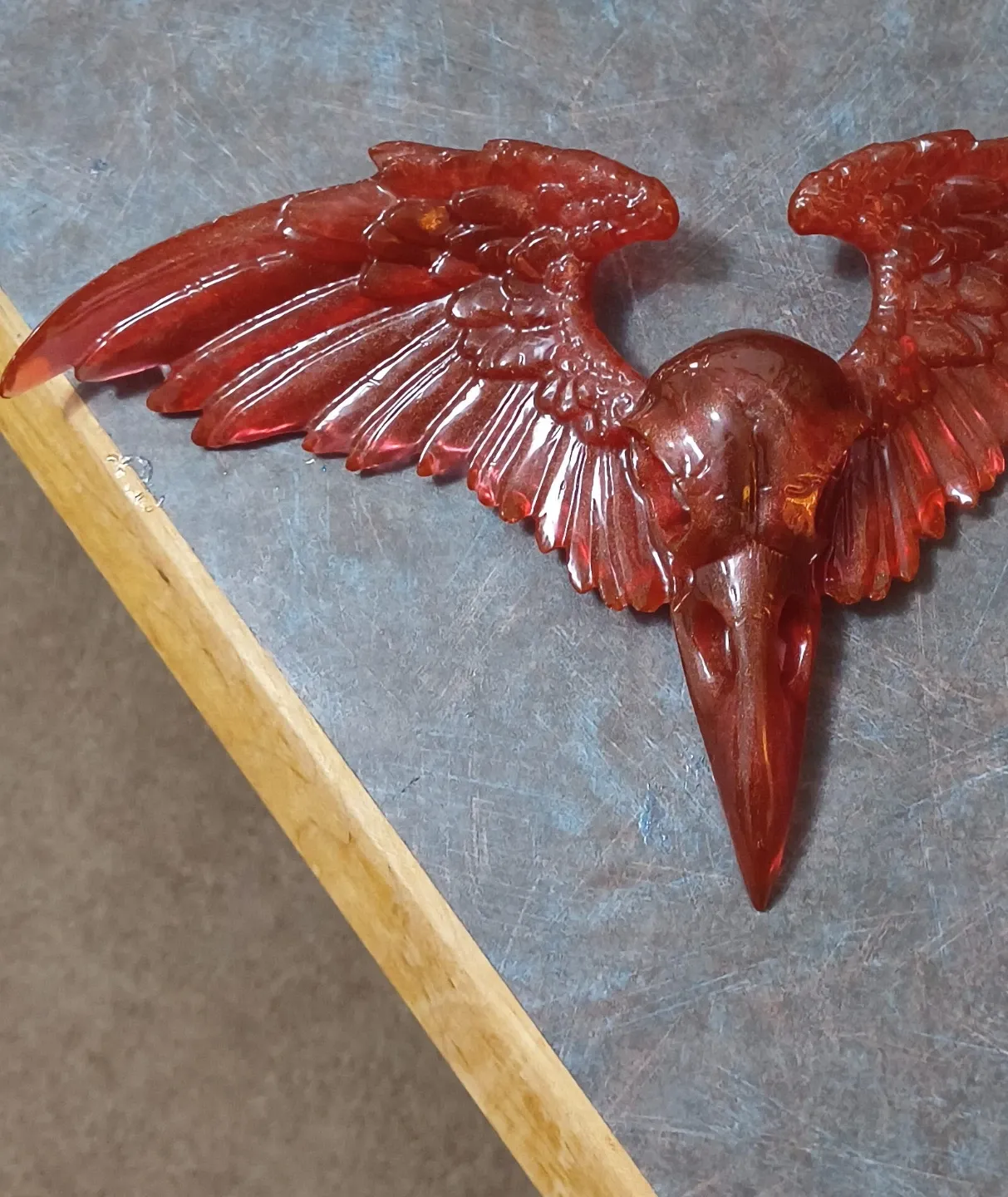 Red resin figurine featuring an eagle skull with outstretched wings. It's a decorative piece with a metallic shimmer. This item could be used for Halloween decor or as part of a collection.