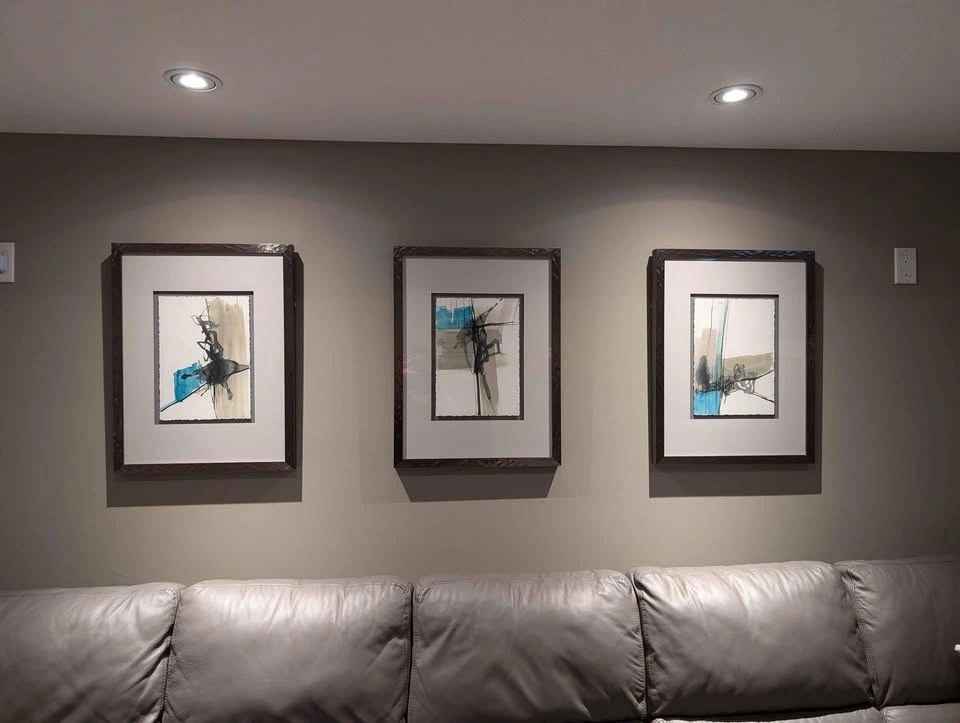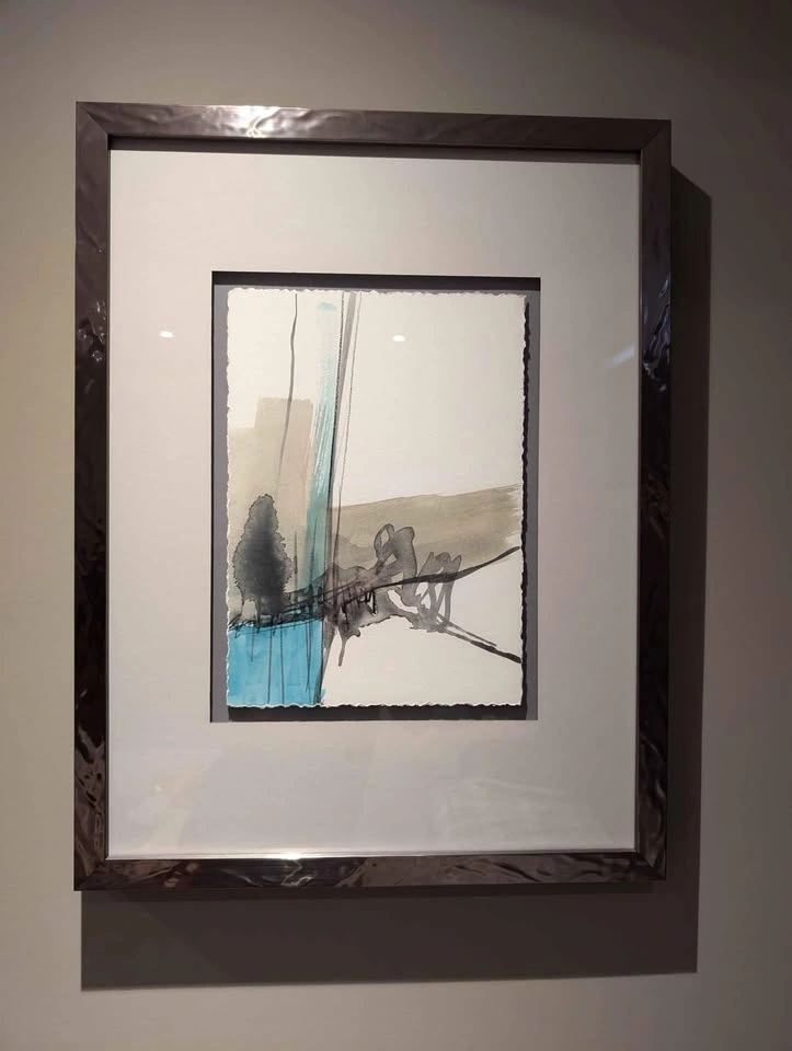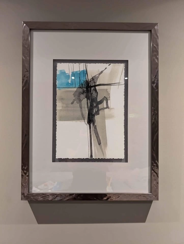 Framed abstract watercolour artwork with a black, grey and blue design on a white background. The frame is pewter and has a textured finish. Each measures 19.5" x 25.5".