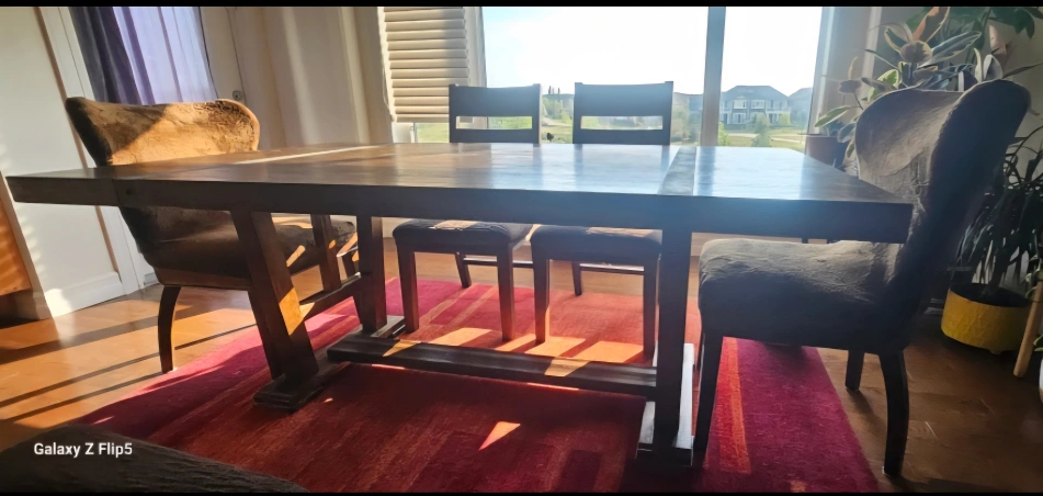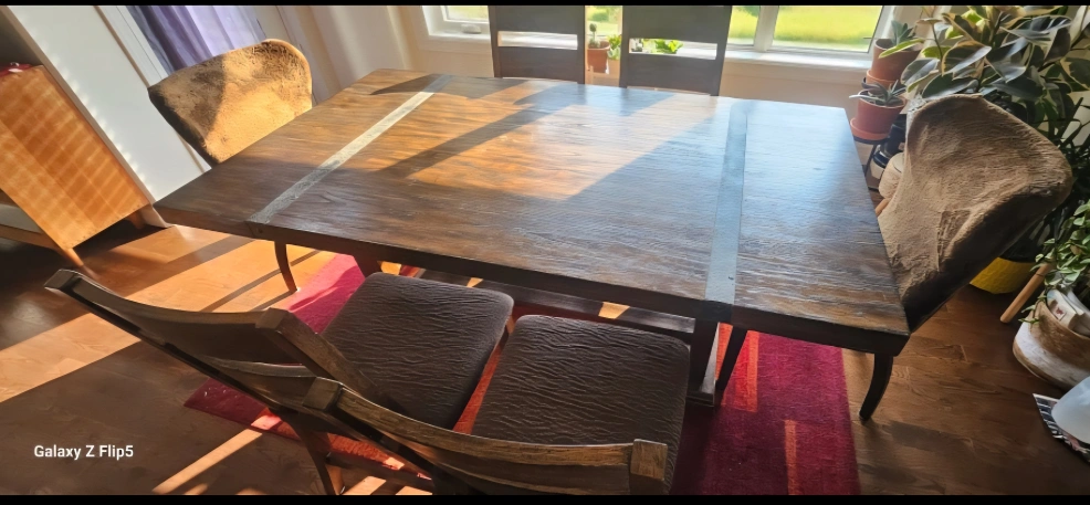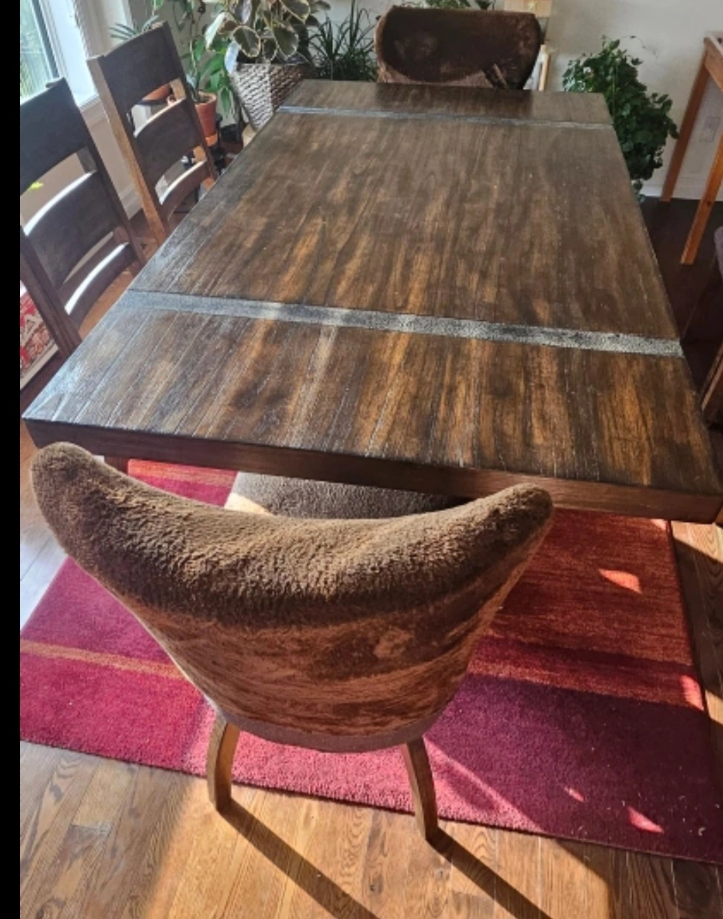 Selling a dining table with four chairs. The table is a dark wood with a unique metal accent. The chairs are upholstered with a soft, patterned fabric. Great for a family dining room or kitchen!