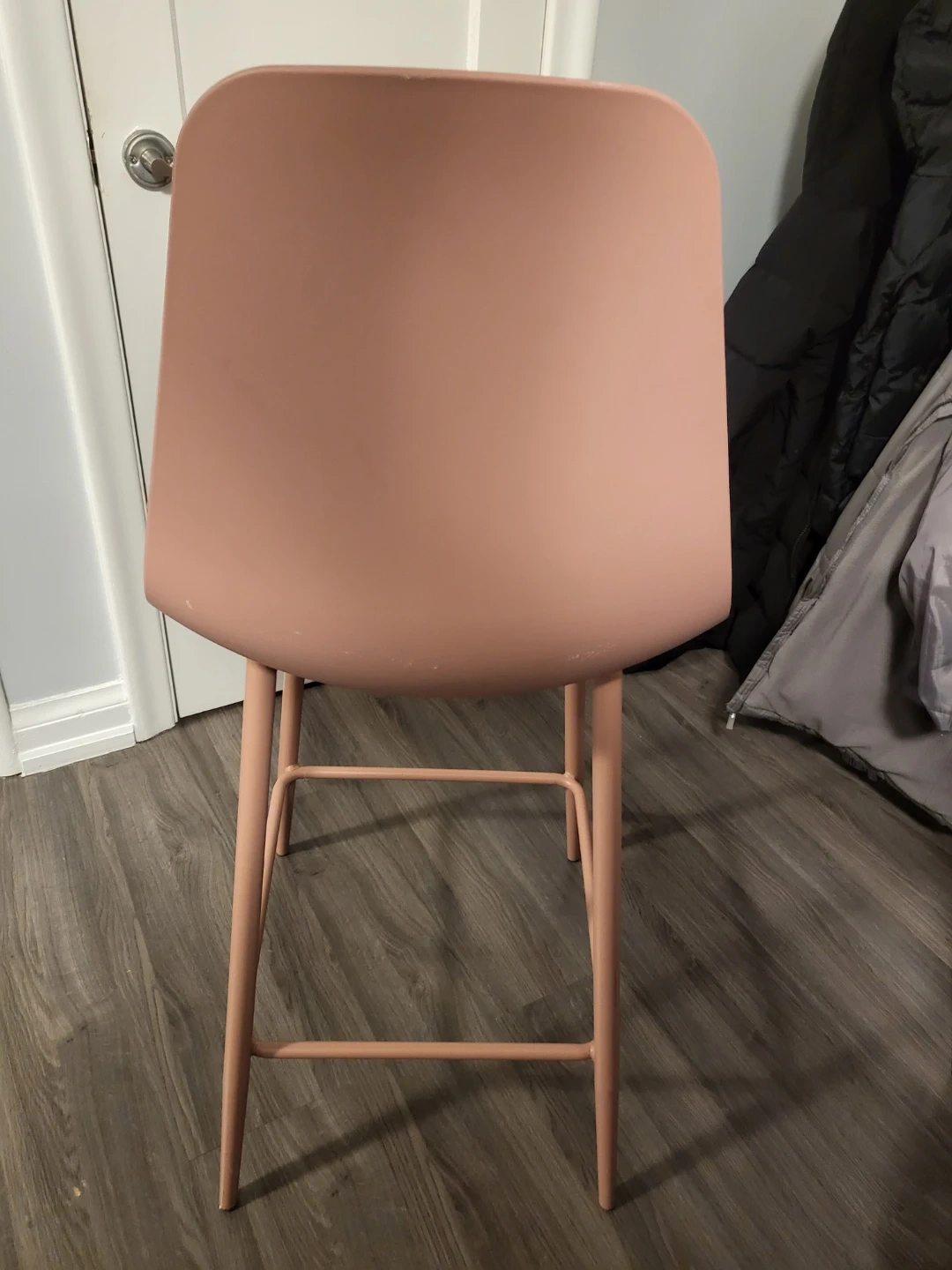 A single bar stool in a dusty rose colour. Its simple, modern design makes it a versatile seating option. Perfect for a kitchen island or home bar.