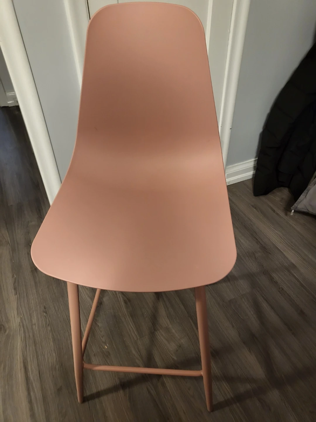 A single bar stool in a dusty rose colour. Its simple, modern design makes it a versatile seating option. Perfect for a kitchen island or home bar.
