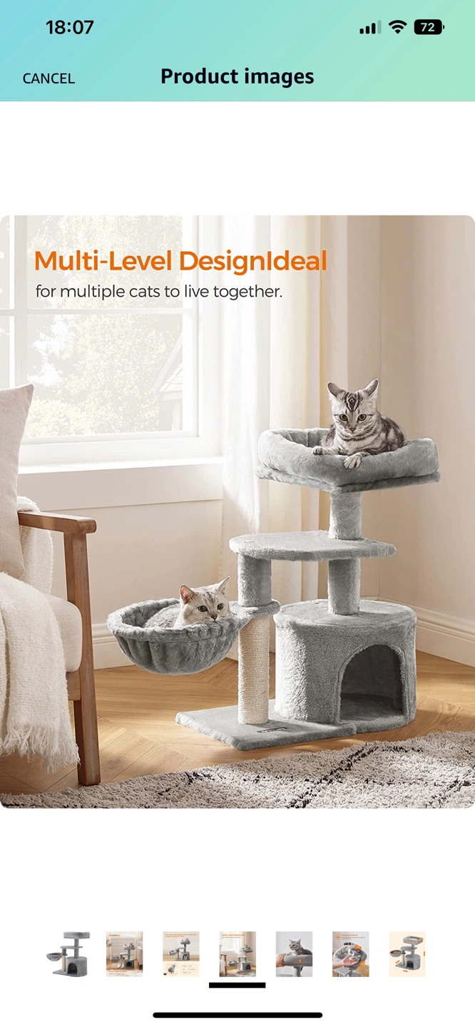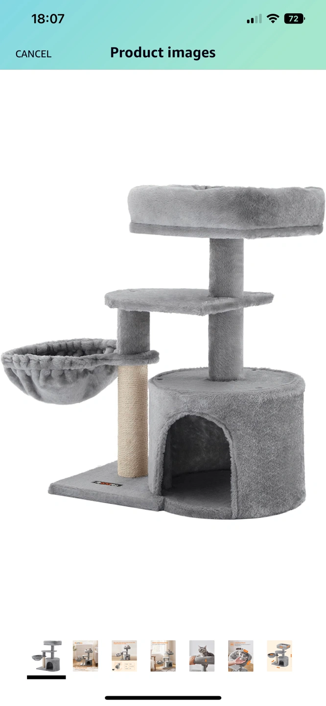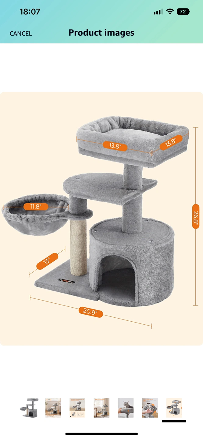 I have attached the actual photo and product images from Amazon. Here’s the link to the actual product: FEANDREA Cat Tree, Small Cat Tower, Cat Condo, Kitten Activity Center with Scratching Post UPCT59W https://a.co/d/f8zUSOp