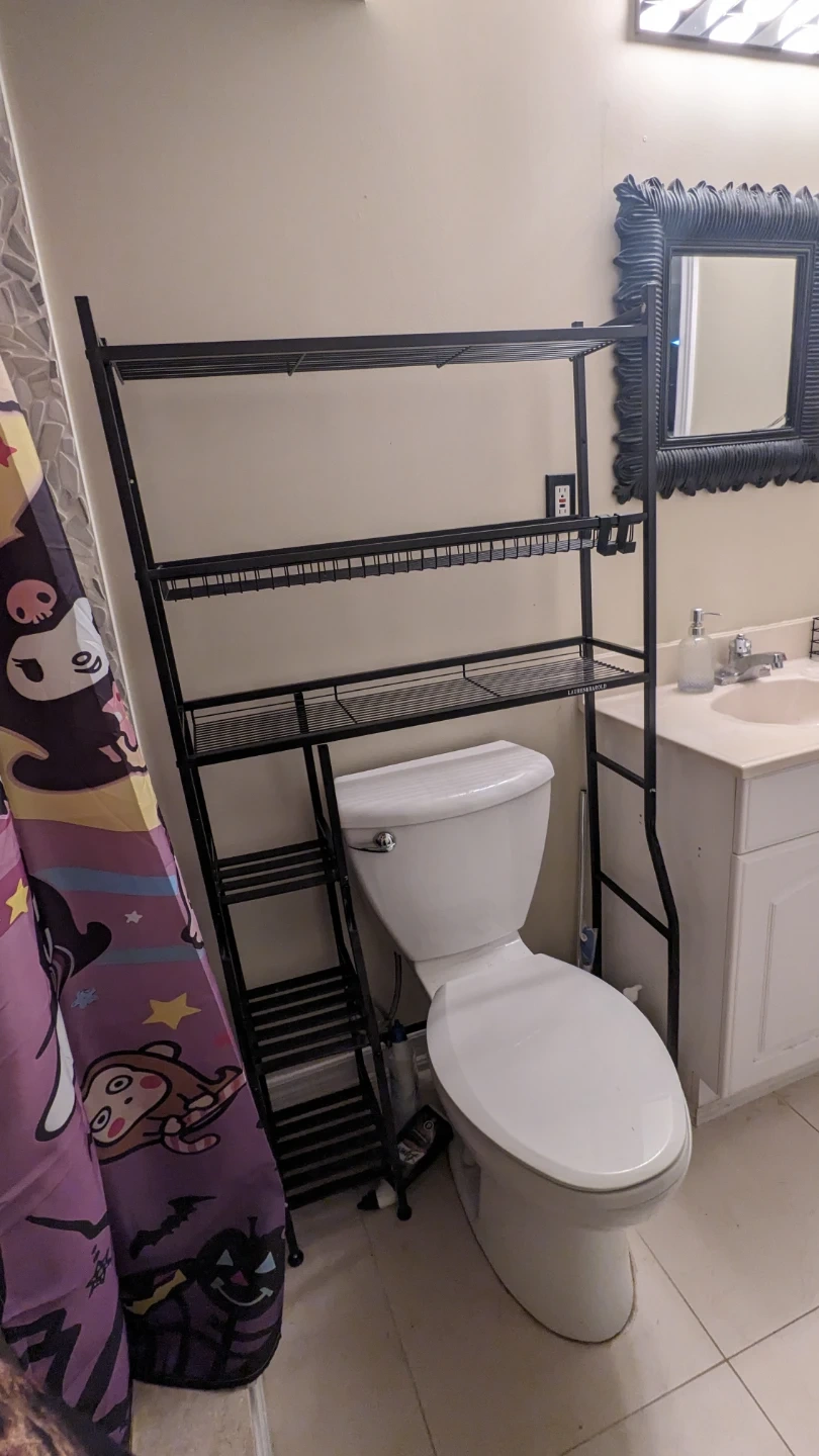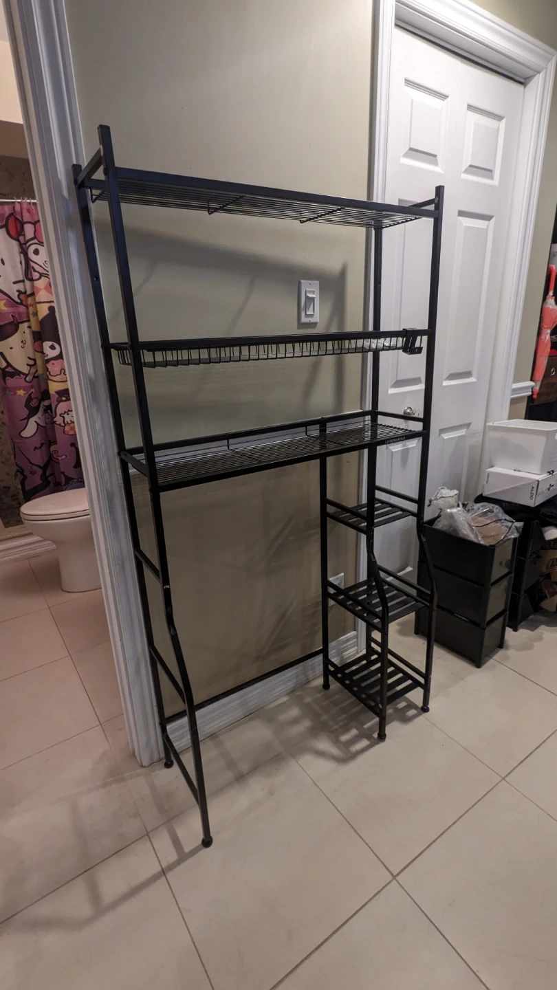 From Amazon. This metal shelf unit provides extra storage above your toilet. It features three tiers of shelving and a metal construction for durability. Fits over standard toilets for a space-saving solution.
