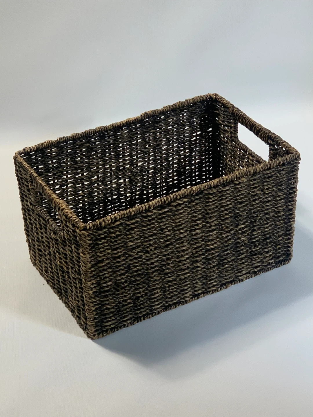 Hand-woven basket for storage and organization. It's made from natural fibers and features built-in handles for easy carrying. The dark, textured finish complements various decor styles.